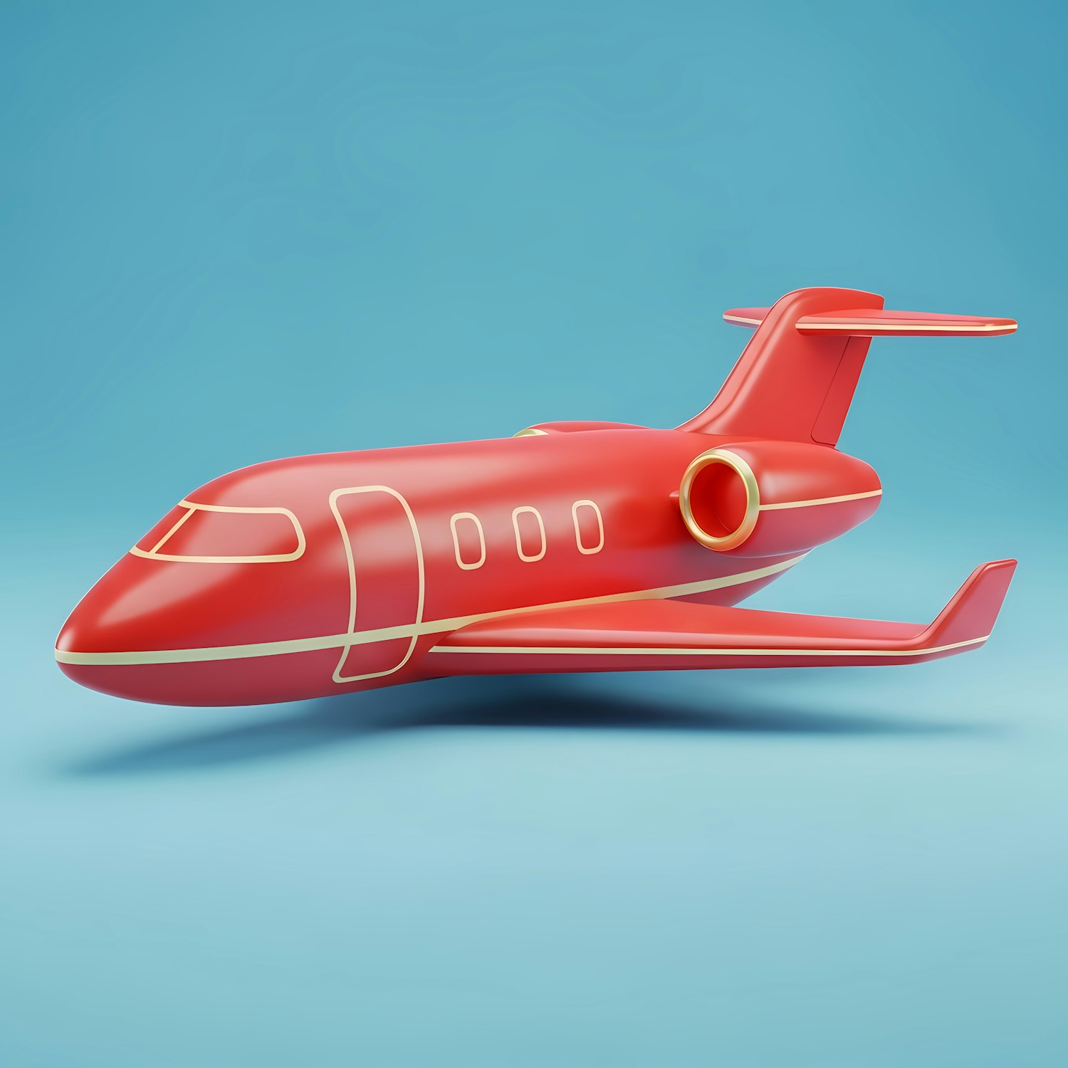 A sleek red and gold private jet in a 3D rendering, set against a gradient blue background, showcasing luxury and modern design.