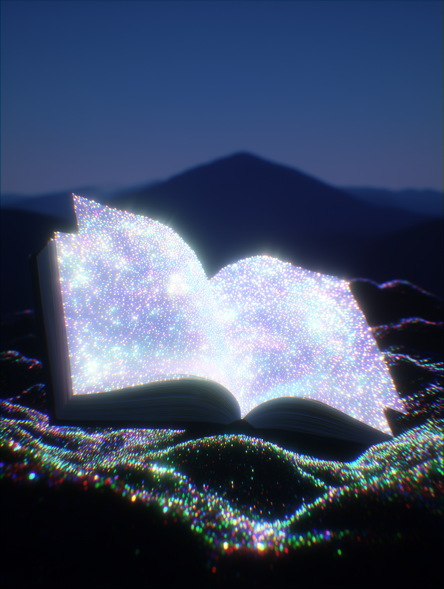 A glowing book emits colorful light in a dark, serene setting with a mountain silhouette in the background, evoking a magical atmosphere.