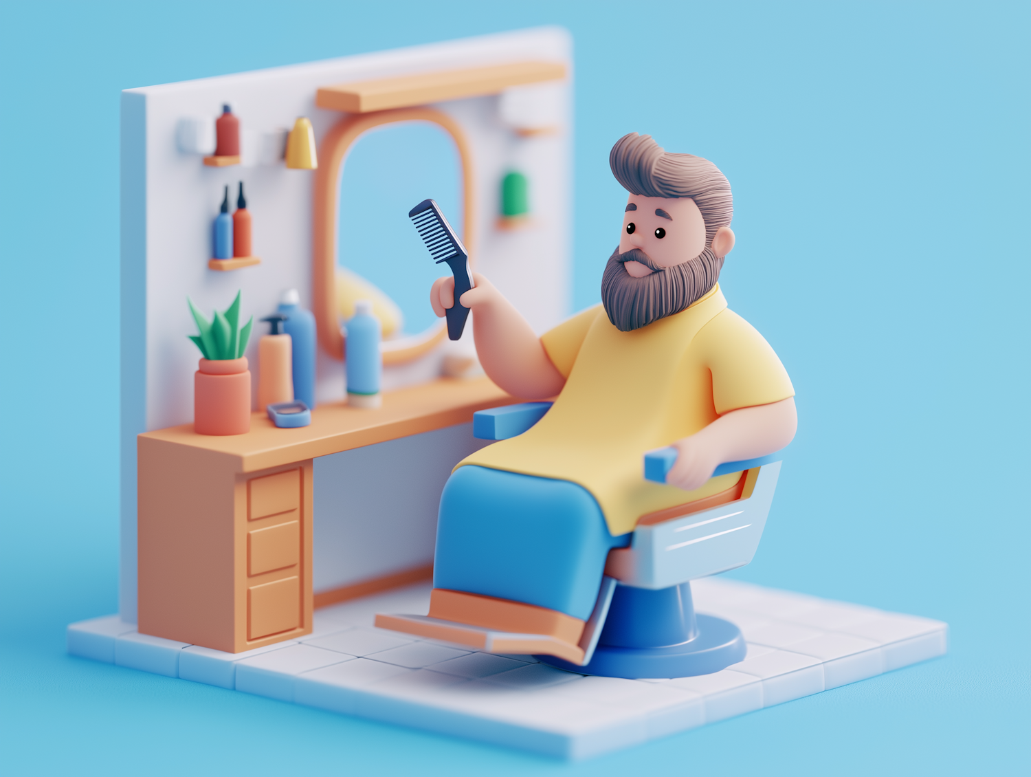 3D illustration of a bearded man in a barber chair holding a comb, surrounded by colorful barber tools and a mirror.