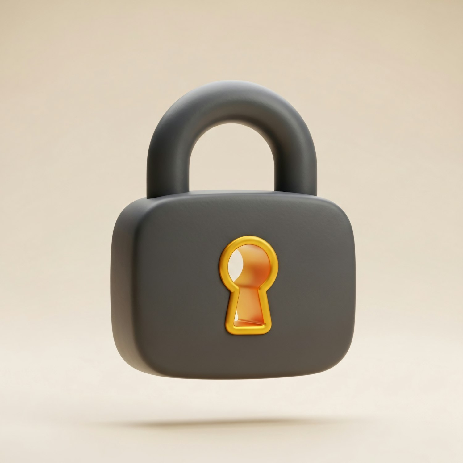 A sleek 3D-rendered padlock with a matte black finish and a golden keyhole, set against a neutral beige background.