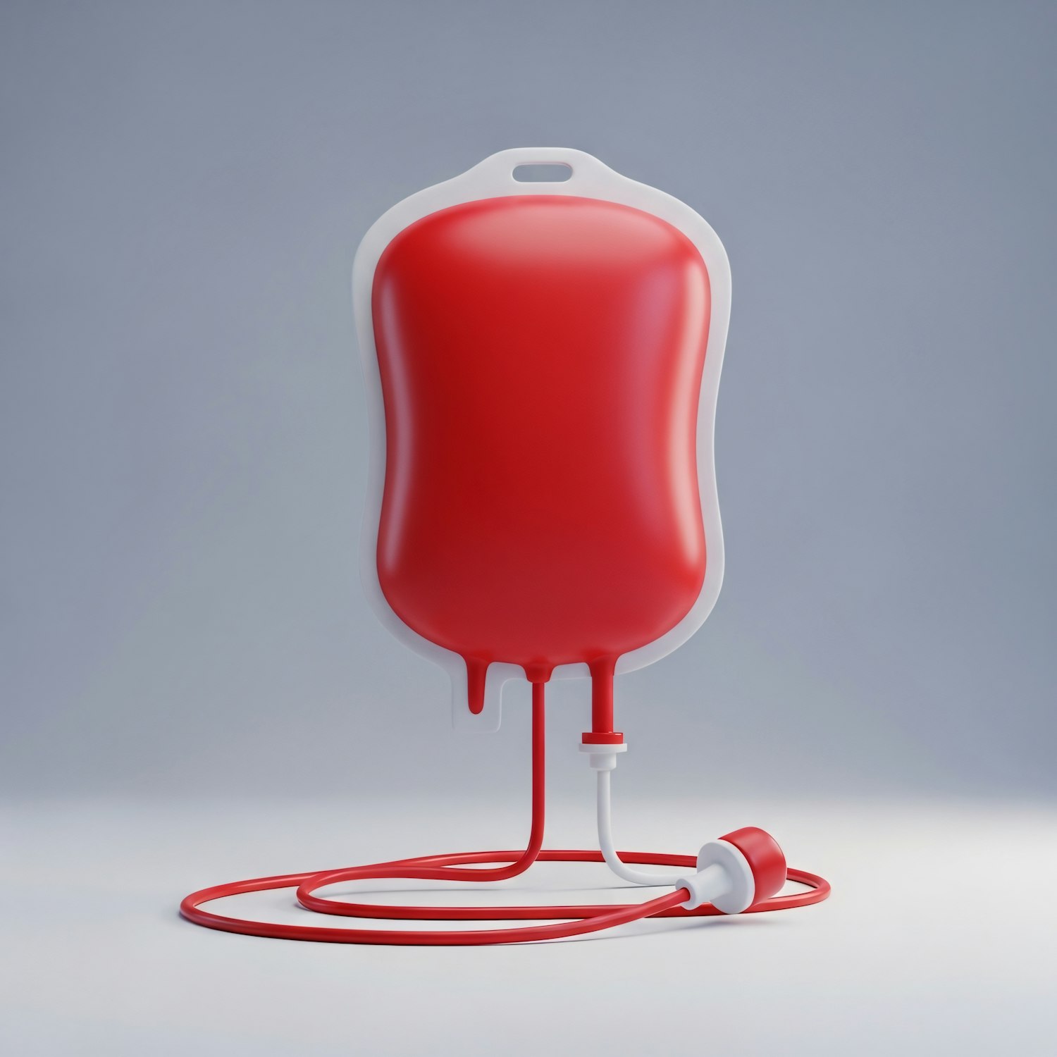 A red medical blood bag with coiled tubing, set against a neutral background, emphasizing its clean and functional design.