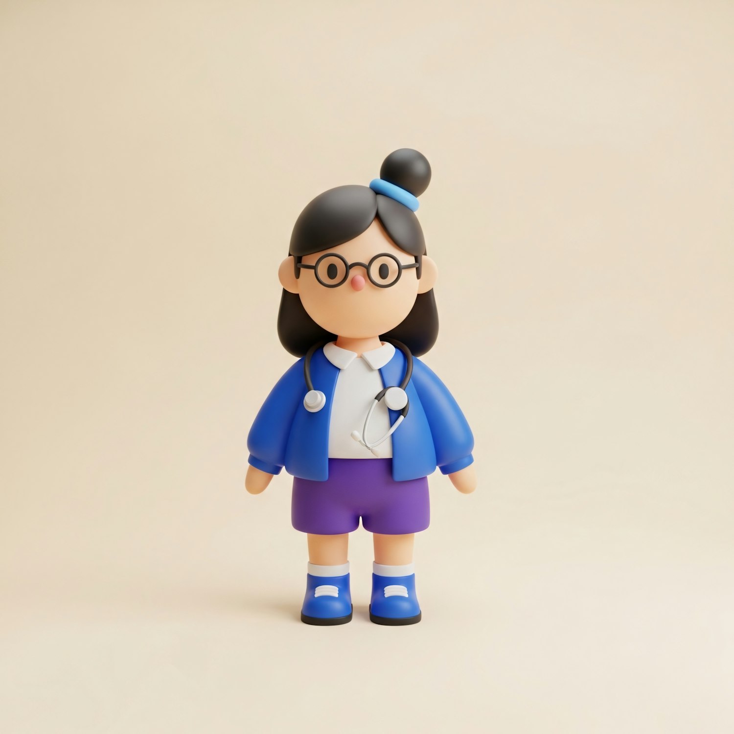 A cute 3D cartoon character with glasses, a stethoscope, and a blue outfit, set against a plain beige background.