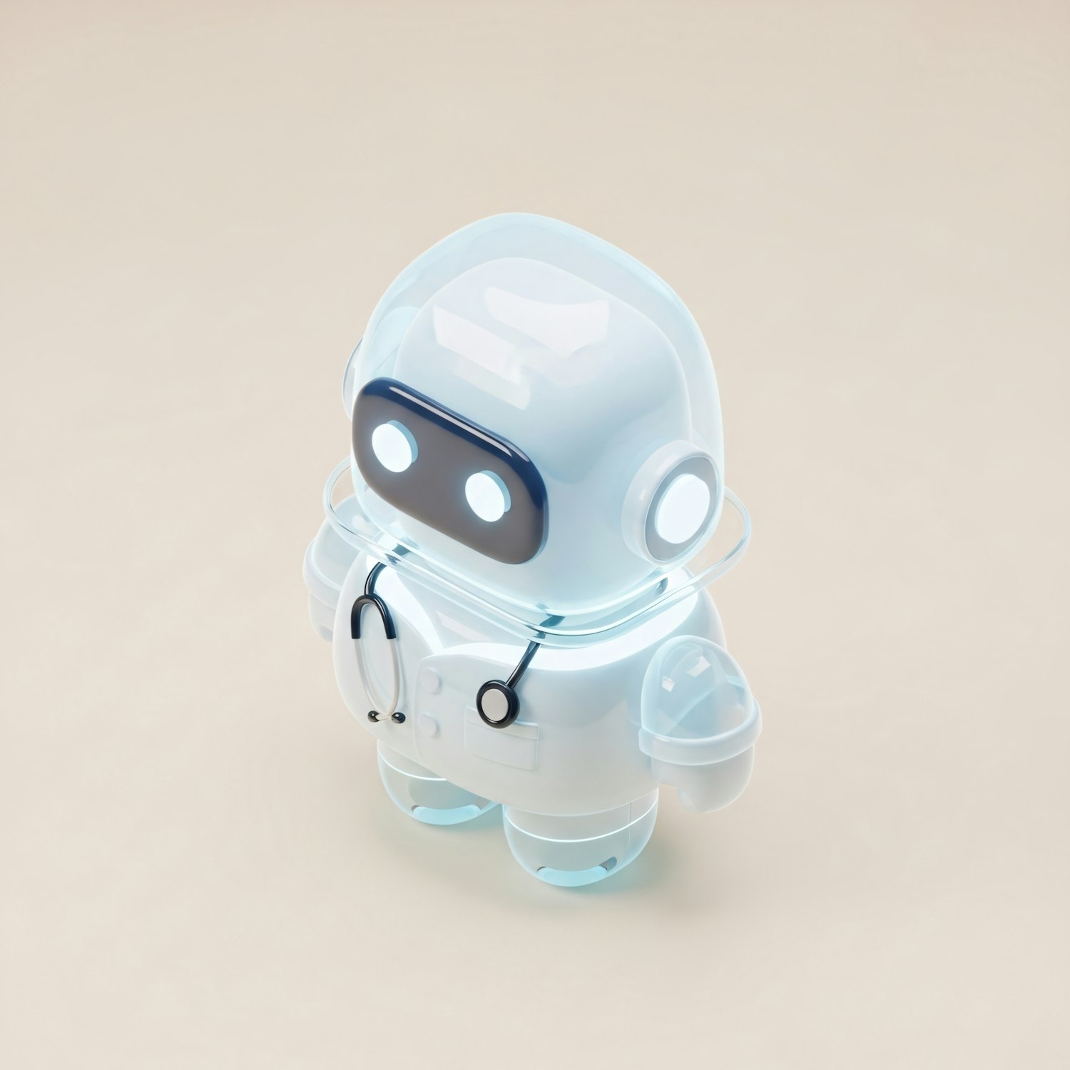 A 3D-rendered medical robot with a stethoscope, glowing eyes, and a sleek, futuristic design in soft blue and white tones.