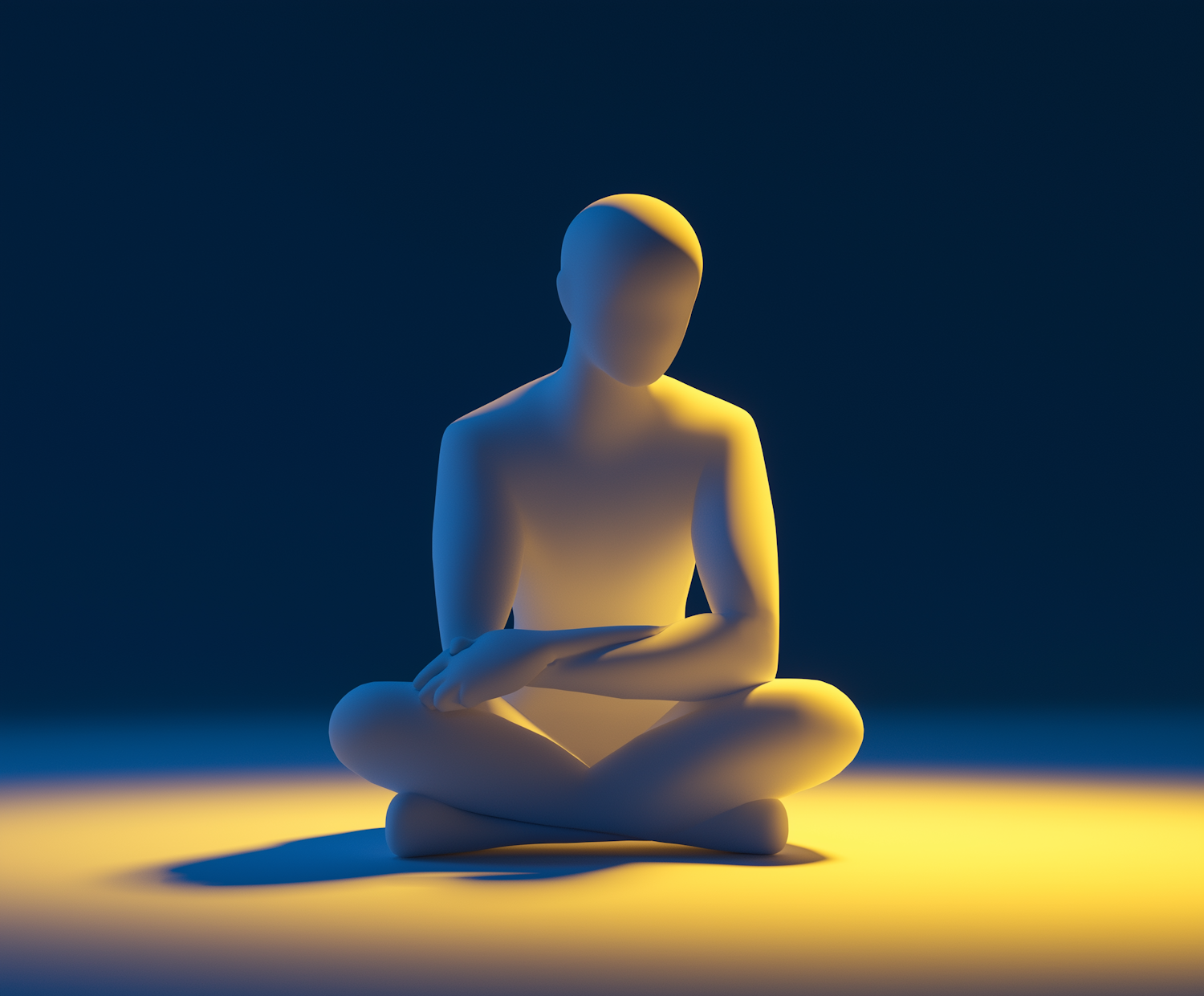 Minimalist 3D rendering of a featureless figure in meditation, illuminated by warm light against a deep blue background.