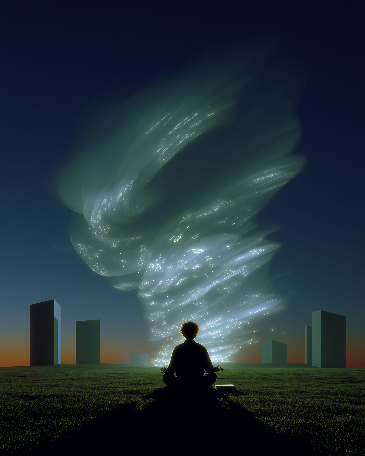 A meditating figure sits before a glowing vortex of light in a serene, otherworldly landscape at dusk.