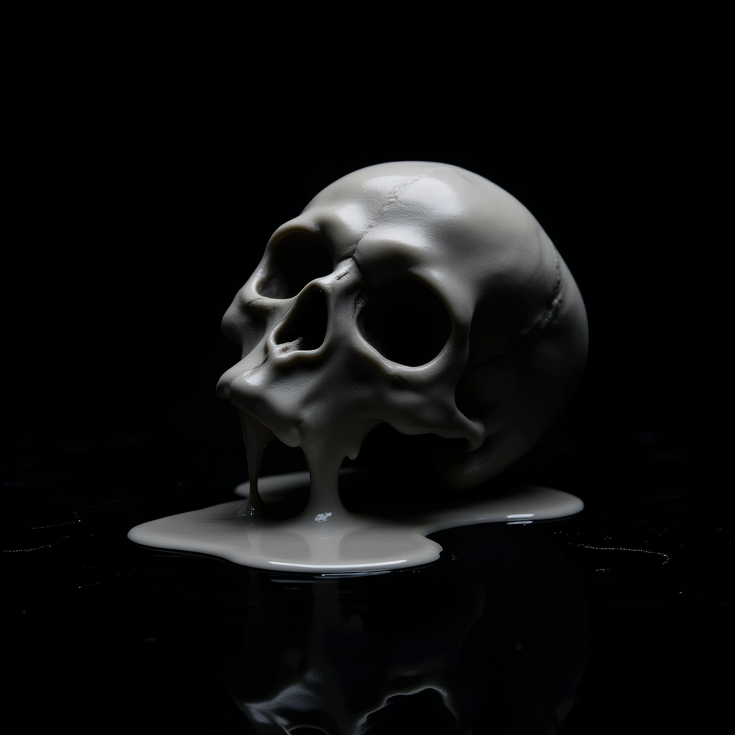 A surreal depiction of a melting skull with a glossy finish, set against a dark background, creating a striking and eerie visual.