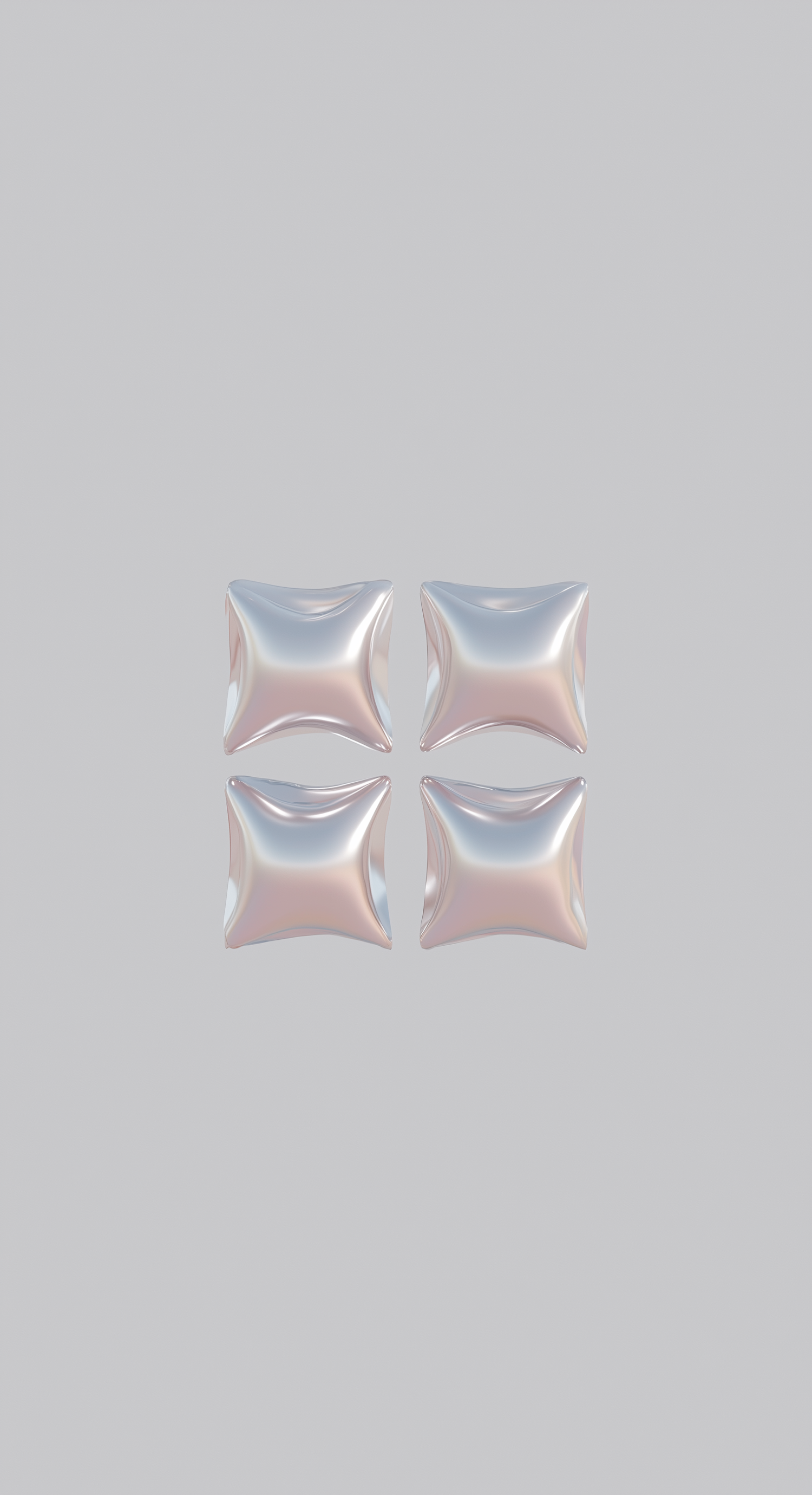 Four metallic, pillow-like objects with a pearlescent sheen arranged in a grid on a light gray background. Minimalistic and futuristic design.