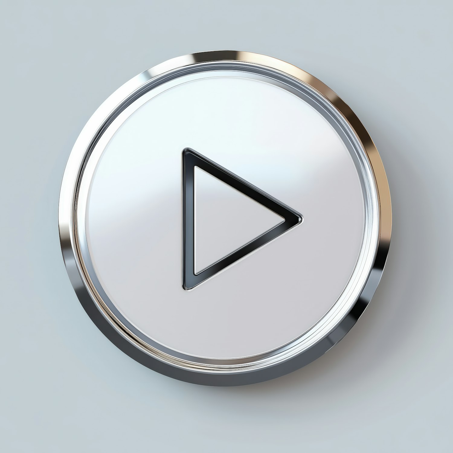 A shiny metallic play button with a chrome border and recessed triangle design, set against a light gray background.