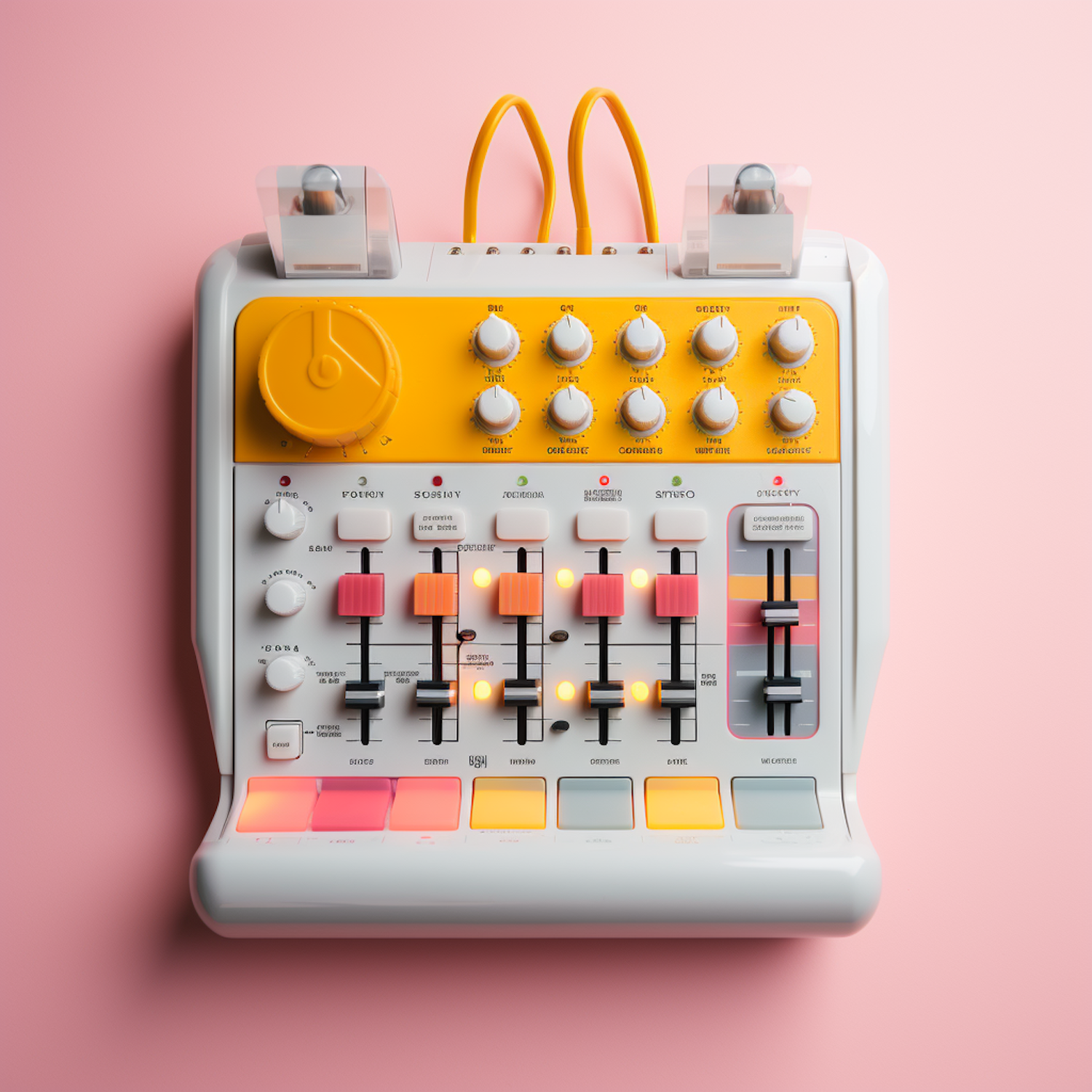 Colorful audio mixer with vibrant knobs and sliders on a pastel pink background, featuring playful design elements.