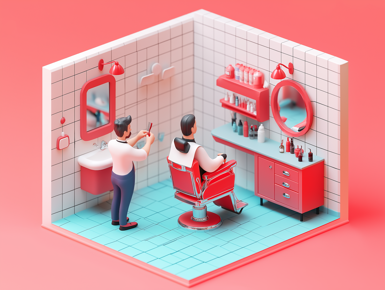 Vibrant 3D illustration of a barbershop with cartoon characters, red and white decor, and a playful, modern atmosphere.