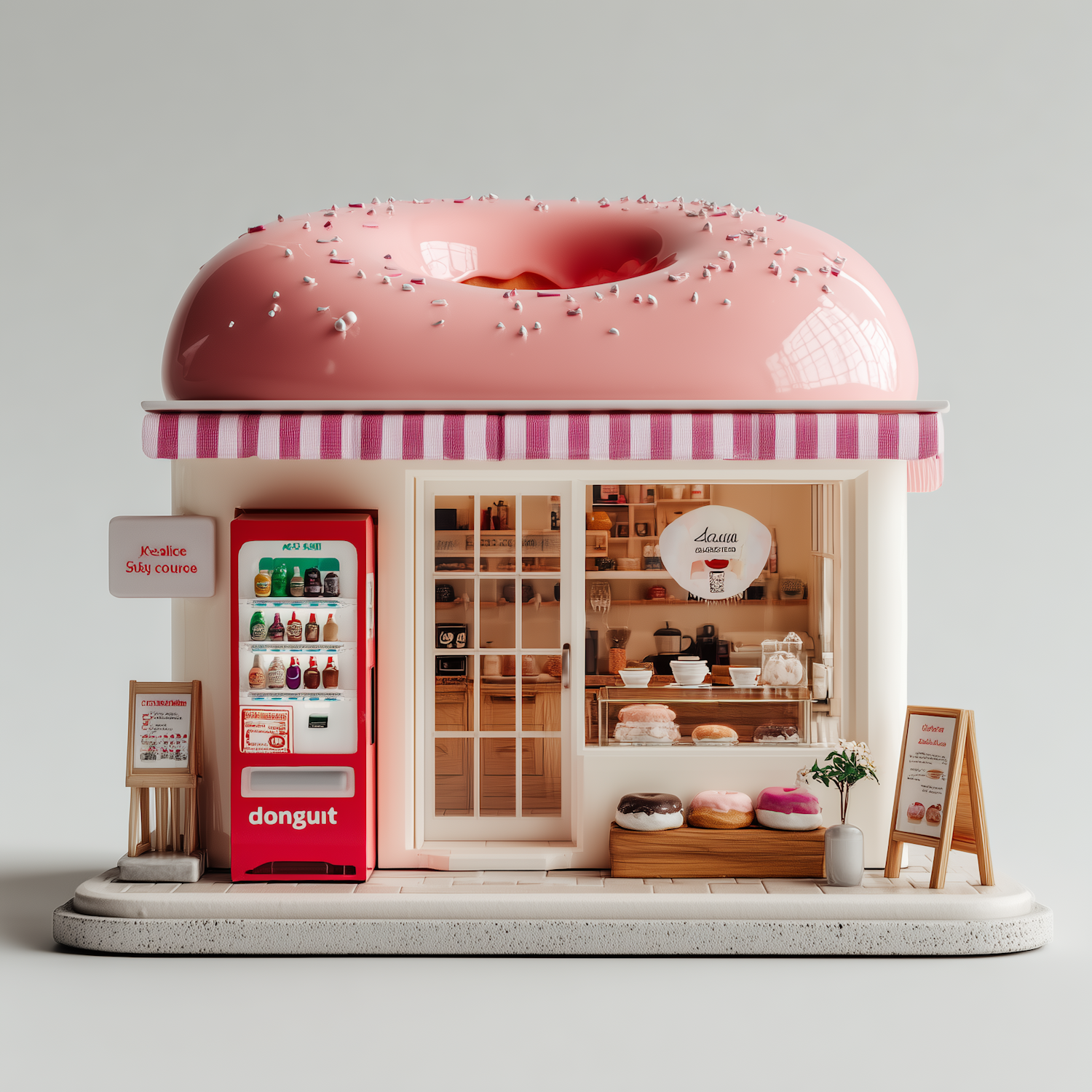 A charming miniature donut shop with a giant pink donut roof, a red vending machine, and a cozy display of delicious treats.