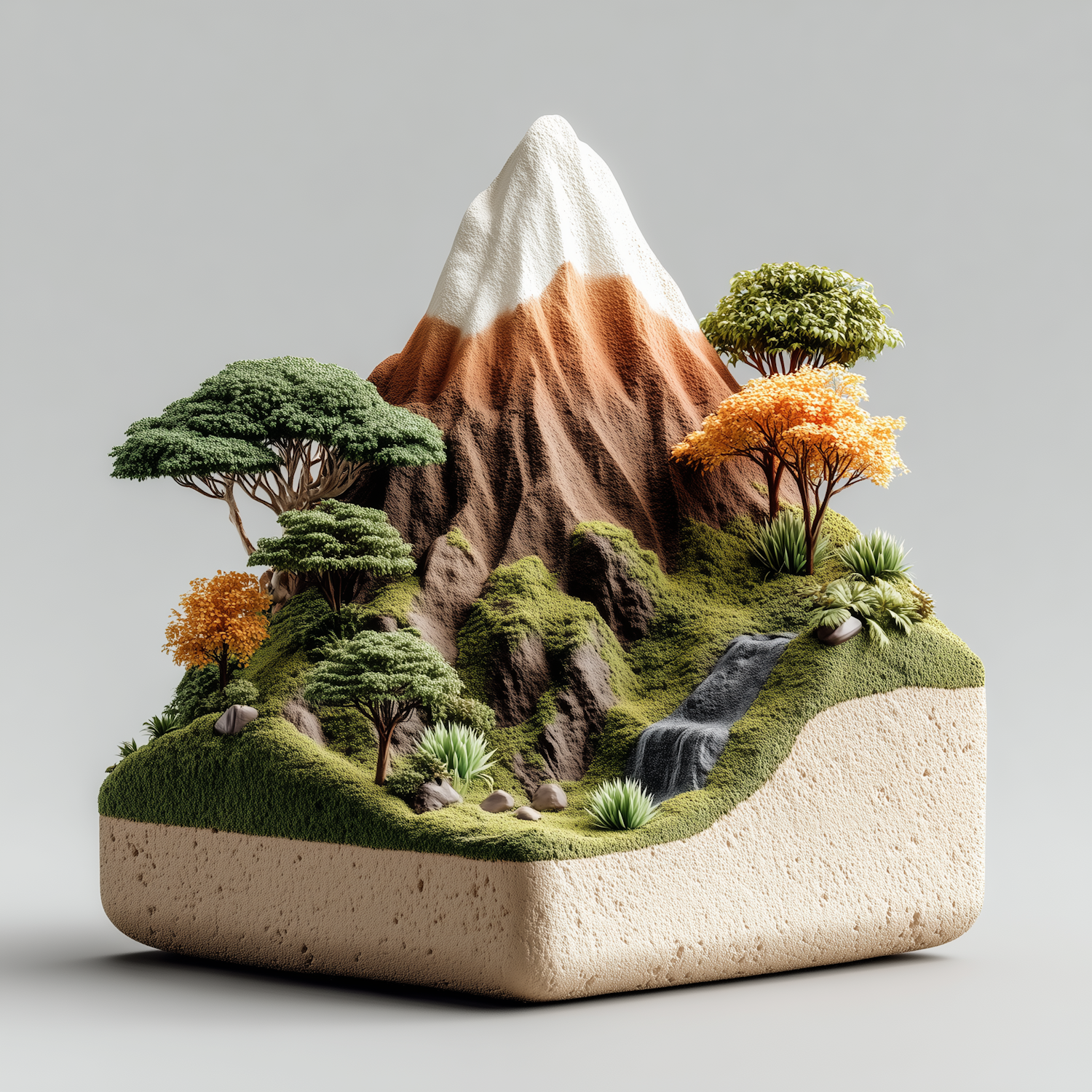 A 3D model of a mountain with snow, trees, and a waterfall, showcasing a detailed cross-section of the terrain.