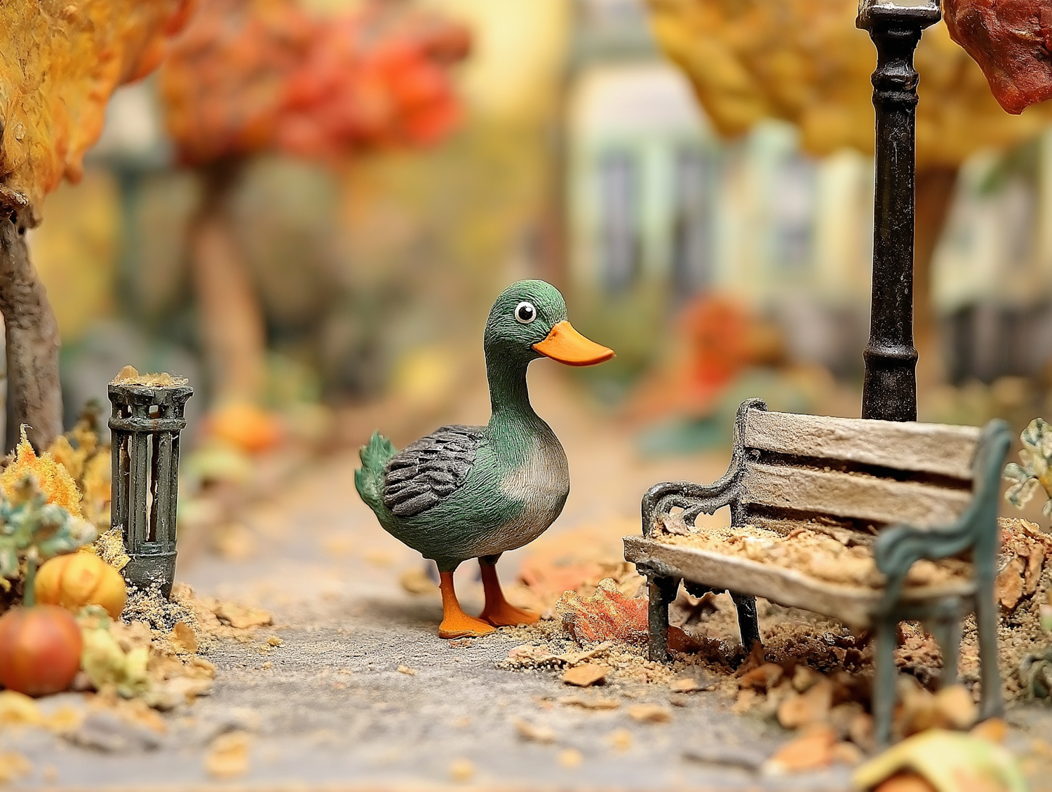 Miniature autumn park scene with a duck figurine, rustic bench, lamppost, and vibrant fall foliage. Cozy and whimsical details.