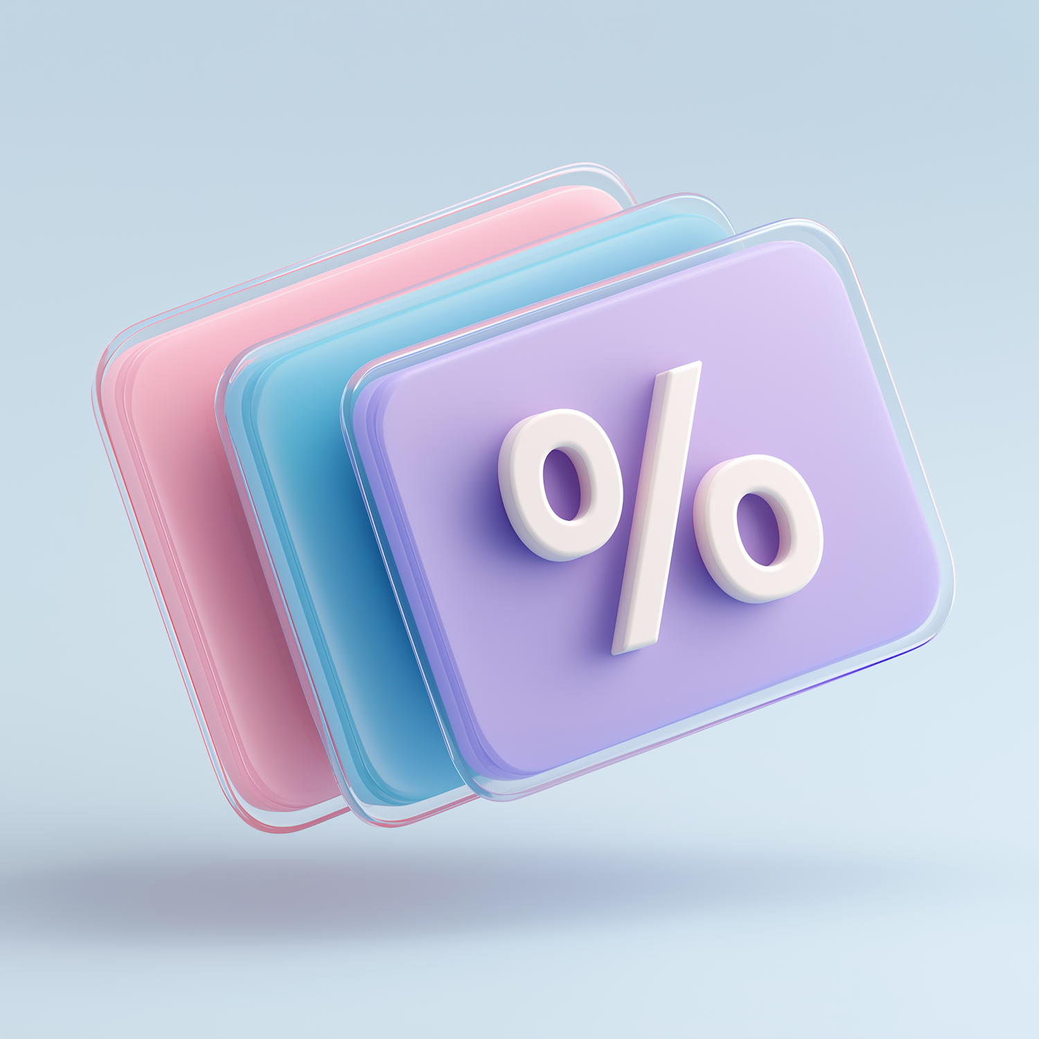 Pastel-colored 3D rectangles feature a prominent percentage symbol. Clean, modern design highlighted by purple, blue, and pink tones.