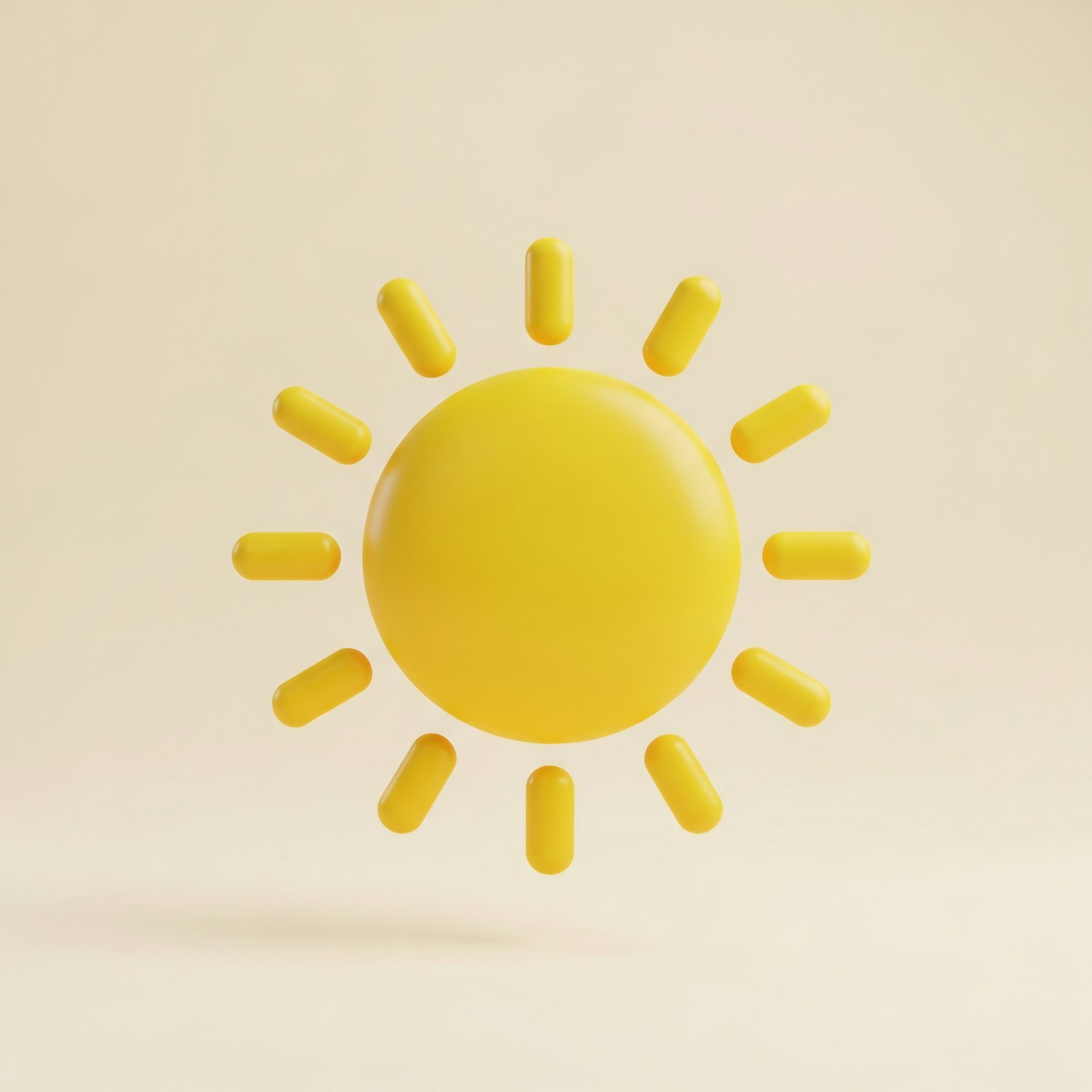 Bright yellow 3D sun icon with rounded rays on a soft beige background, showcasing a clean and minimalistic design.