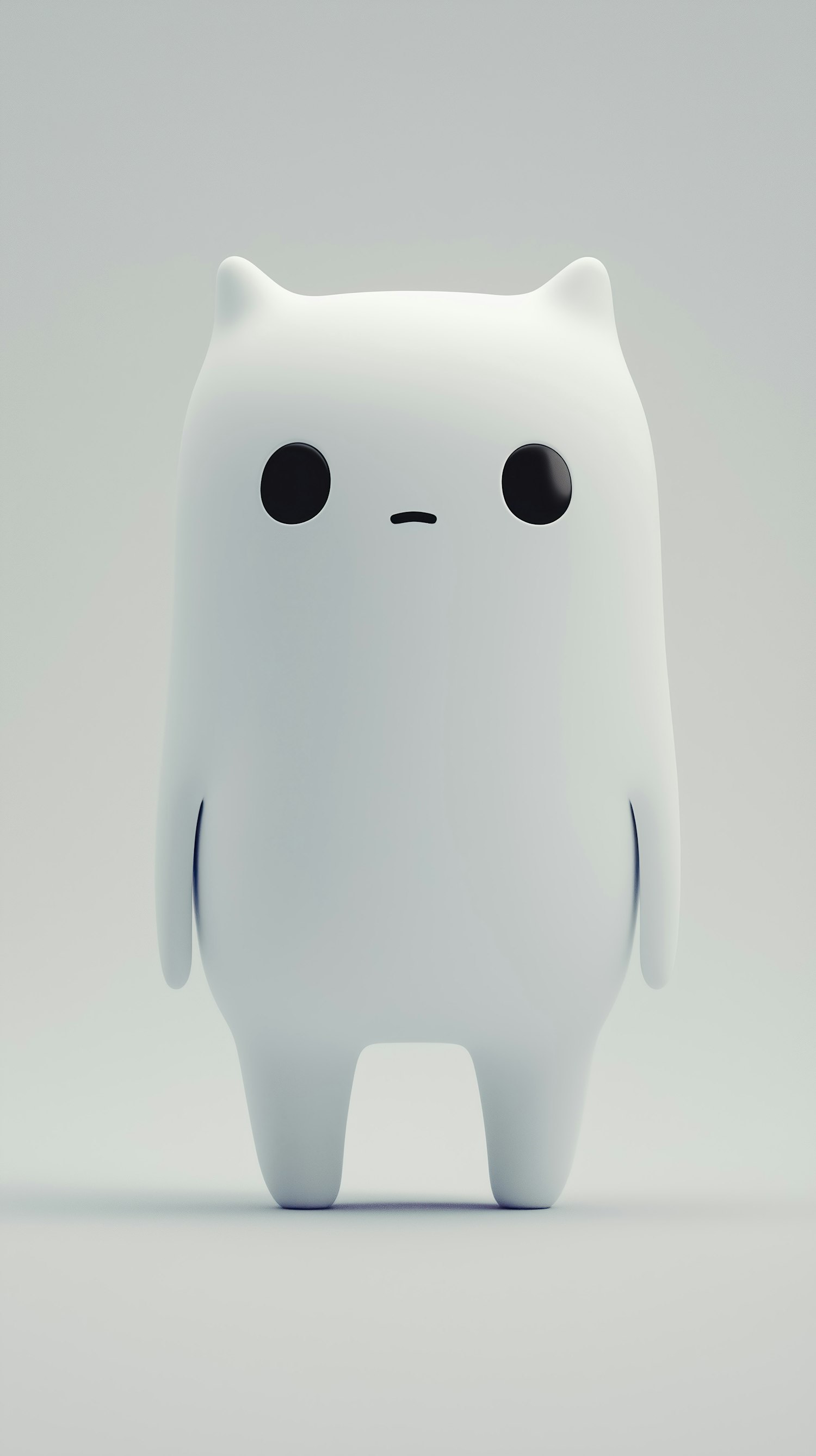 Adorable 3D-rendered cat-like character with a minimalist design, large black eyes, and a neutral expression on a soft gray background.