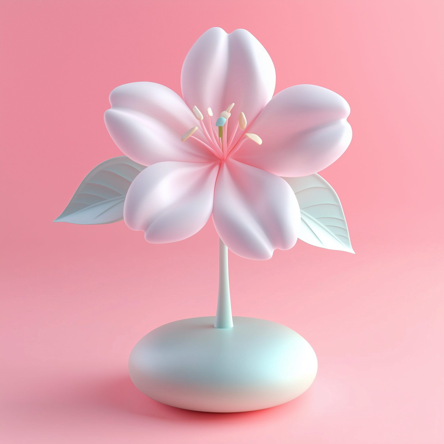 A soft pink 3D-rendered flower with pastel tones, delicate petals, and a smooth mint base against a solid pink background.