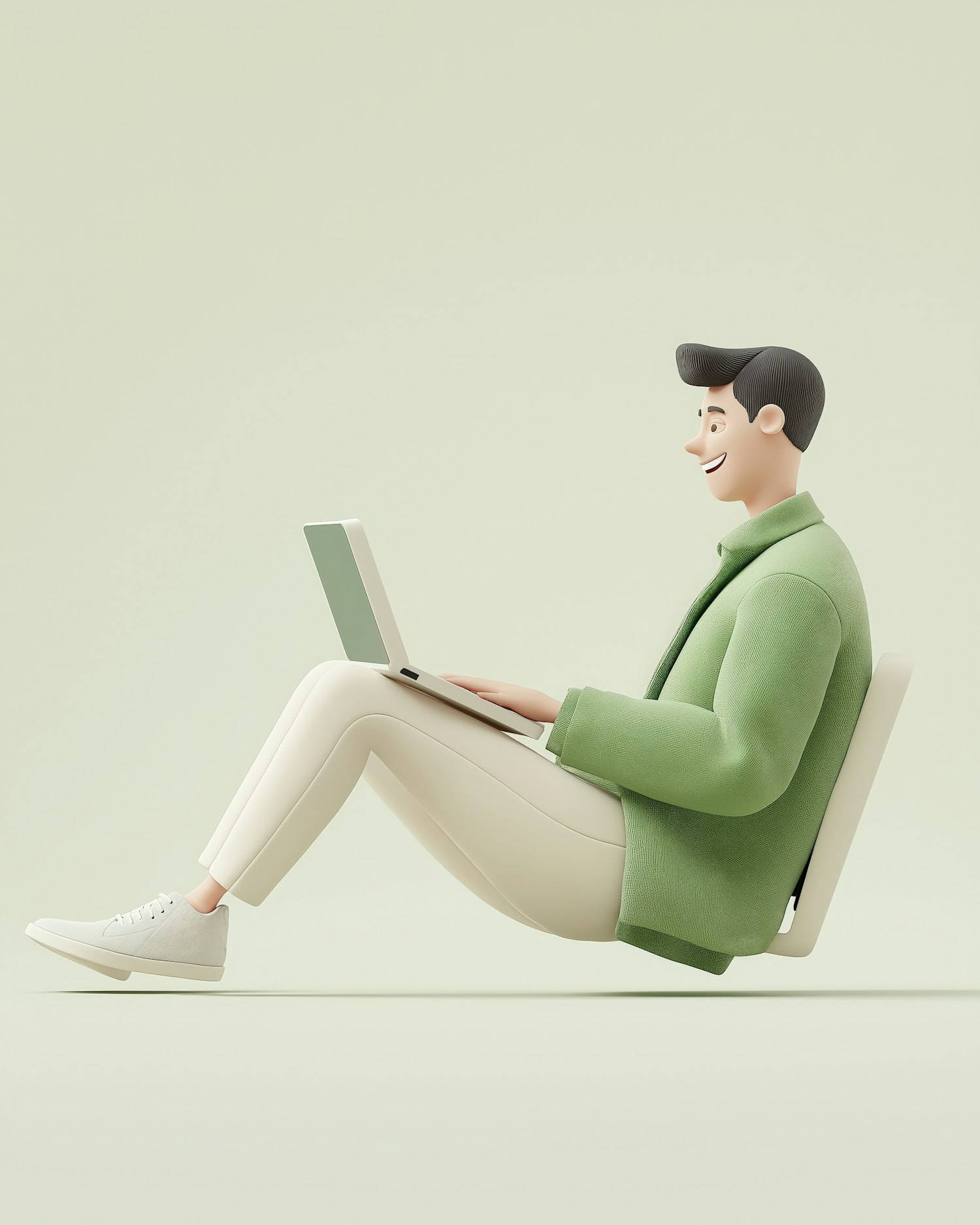 Minimalist 3D illustration of a cheerful person using a laptop, dressed in green and white, set against a soft pale green background.