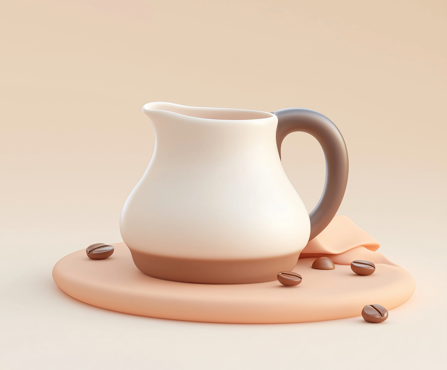 Minimalist 3D illustration of a cream jug with coffee beans on a peach surface, set against a soft beige background.