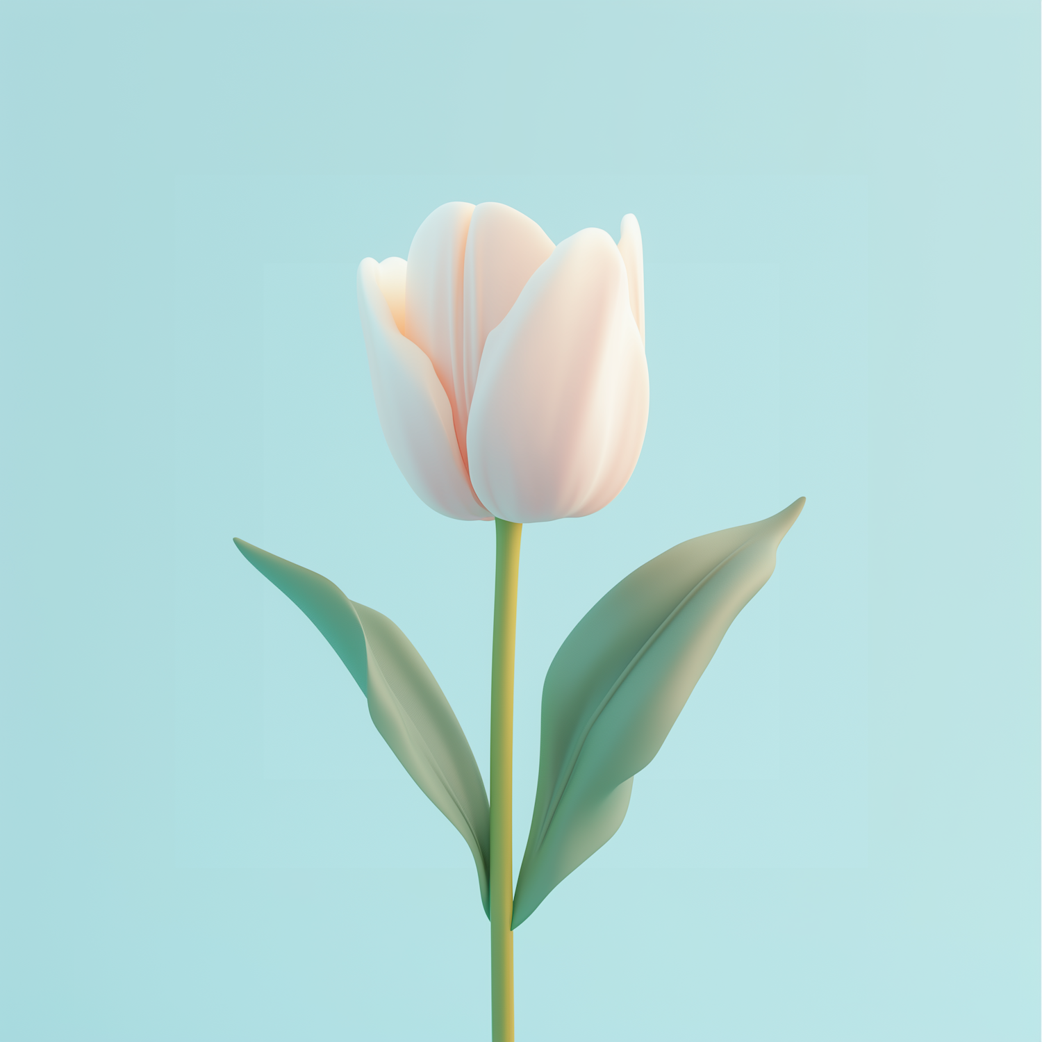 A delicate 3D-rendered tulip with pale pink petals and green leaves on a soft aqua blue background. Perfect for minimalist designs.