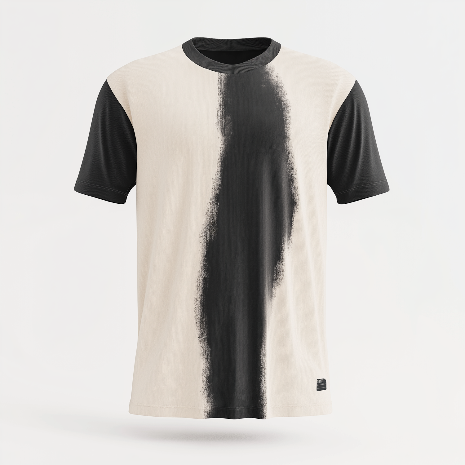 Modern t-shirt with a bold black vertical stripe on a beige background, featuring black sleeves and collar for a striking look.