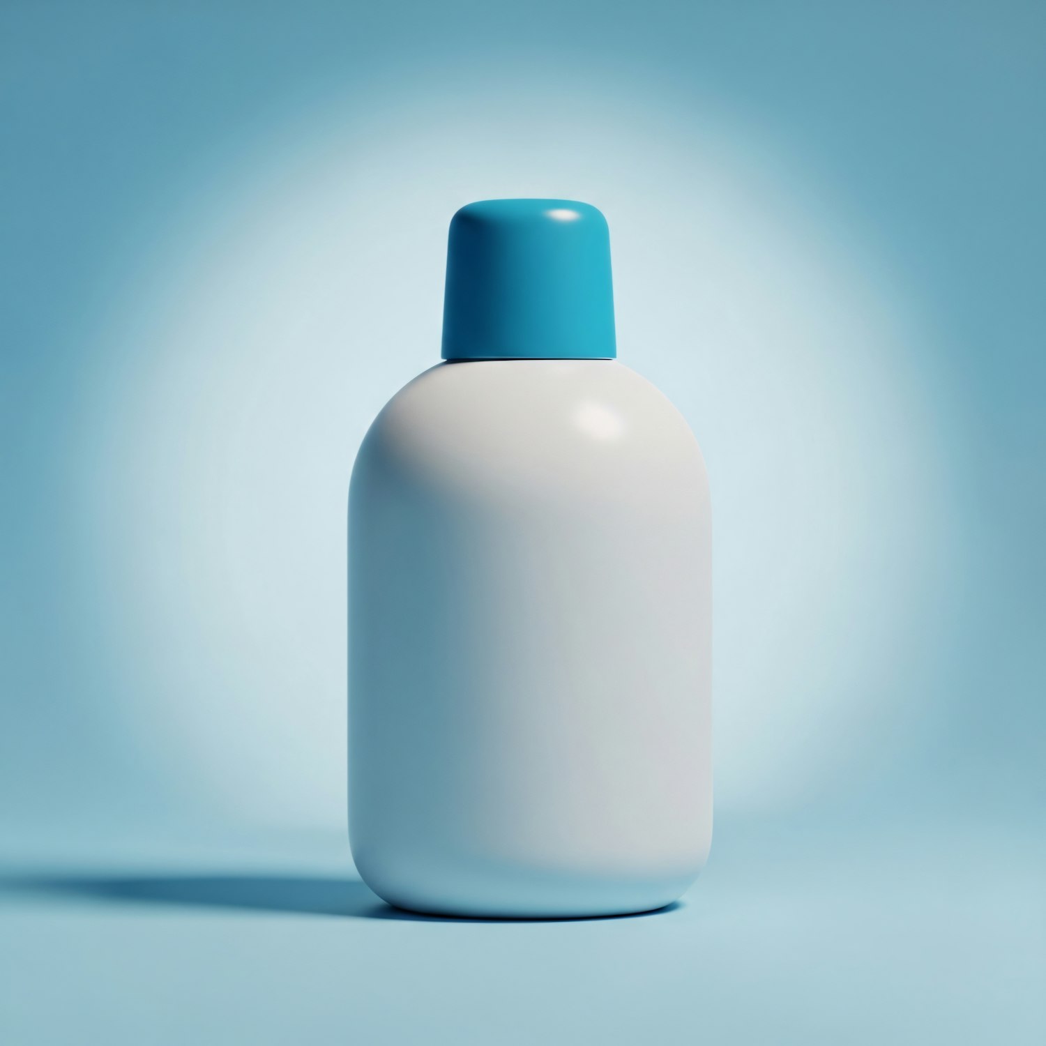 A white bottle with a blue cap on a gradient blue background, showcasing a clean and minimalistic design.