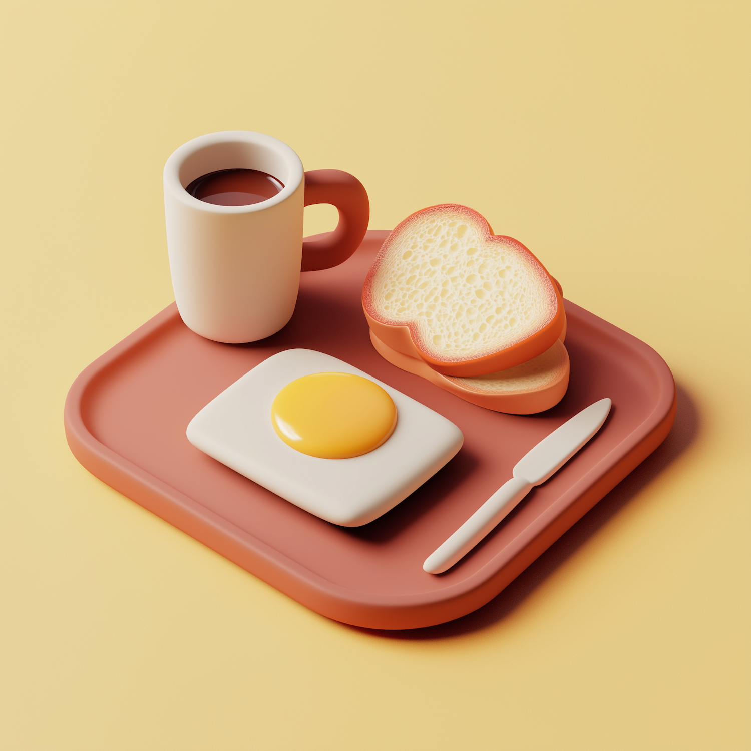 Minimalist 3D breakfast setup with coffee, bread, and egg on a red tray against a soft yellow background.