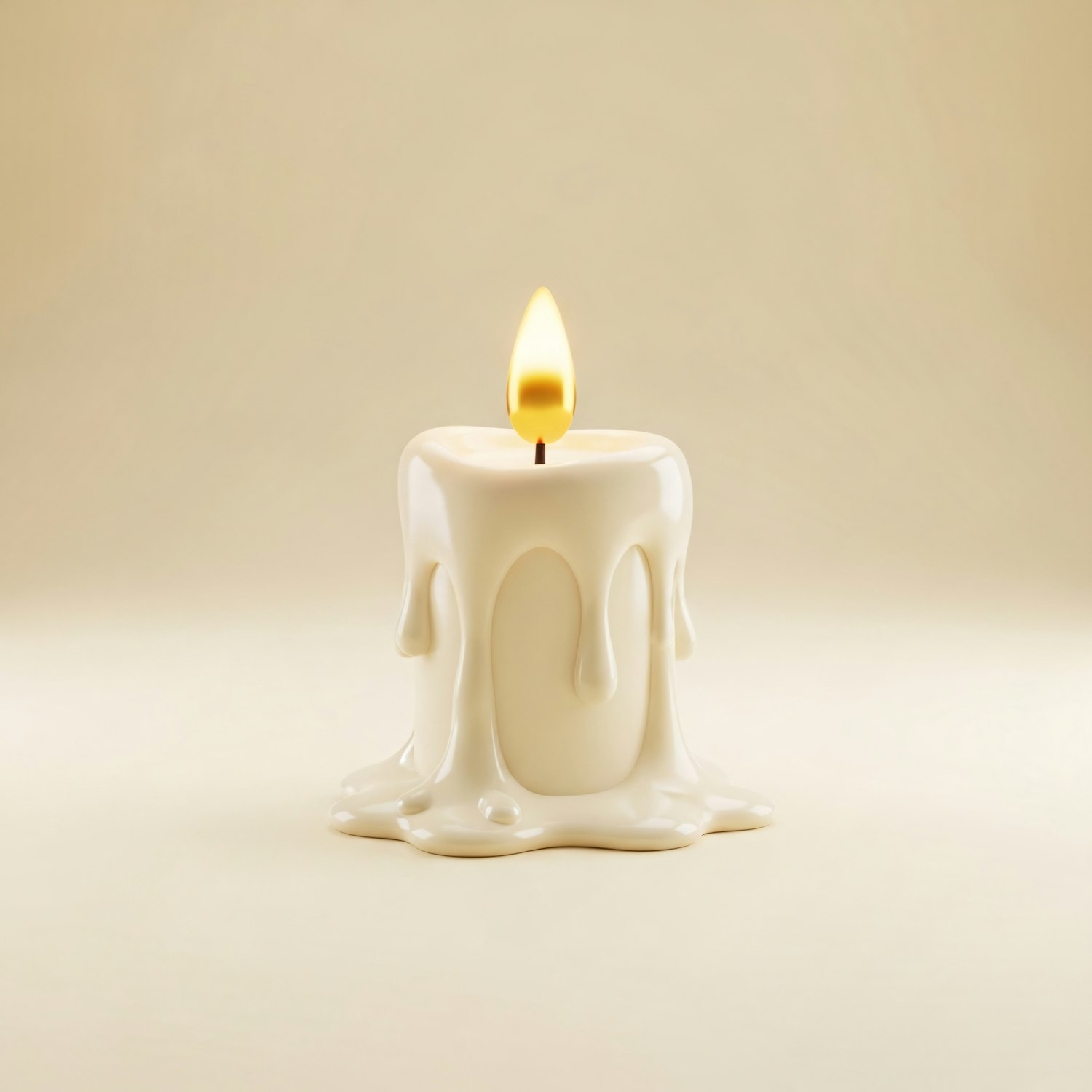 A creamy white candle with a melting wax effect and a glowing flame, set against a soft beige background for a minimalistic look.