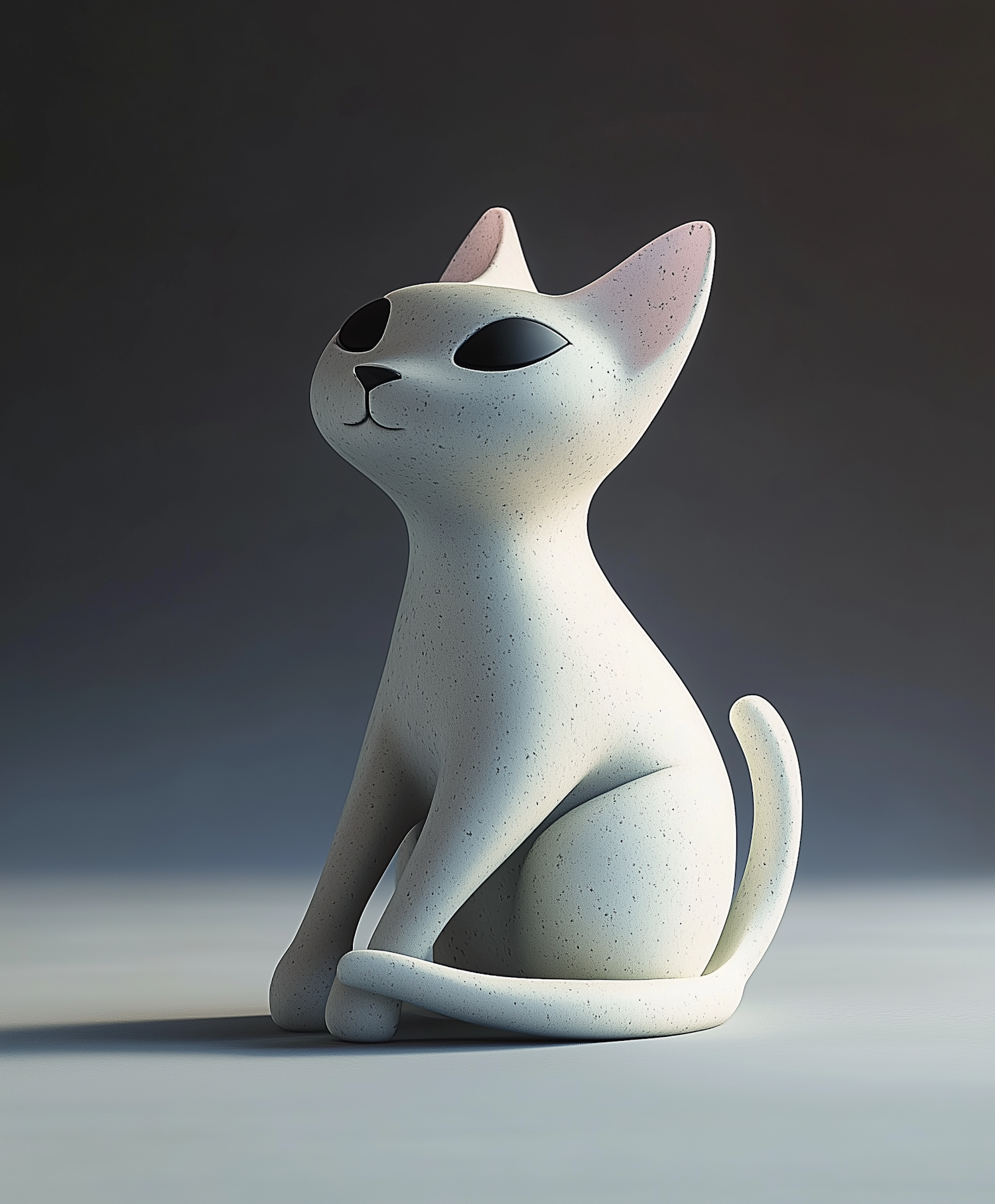 Minimalist 3D-rendered cat sculpture with speckled white texture, black eyes, and pink ear accents, sitting gracefully on a neutral background.