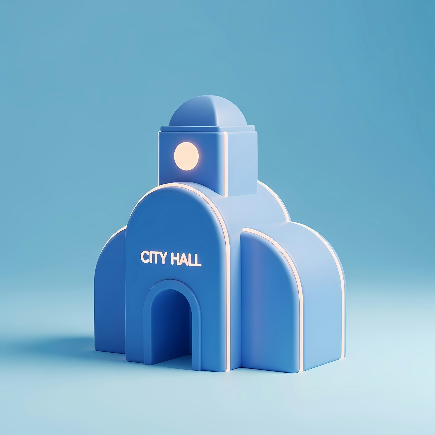 A minimalist 3D model of a city hall building in blue with soft lighting and a clean, modern design.