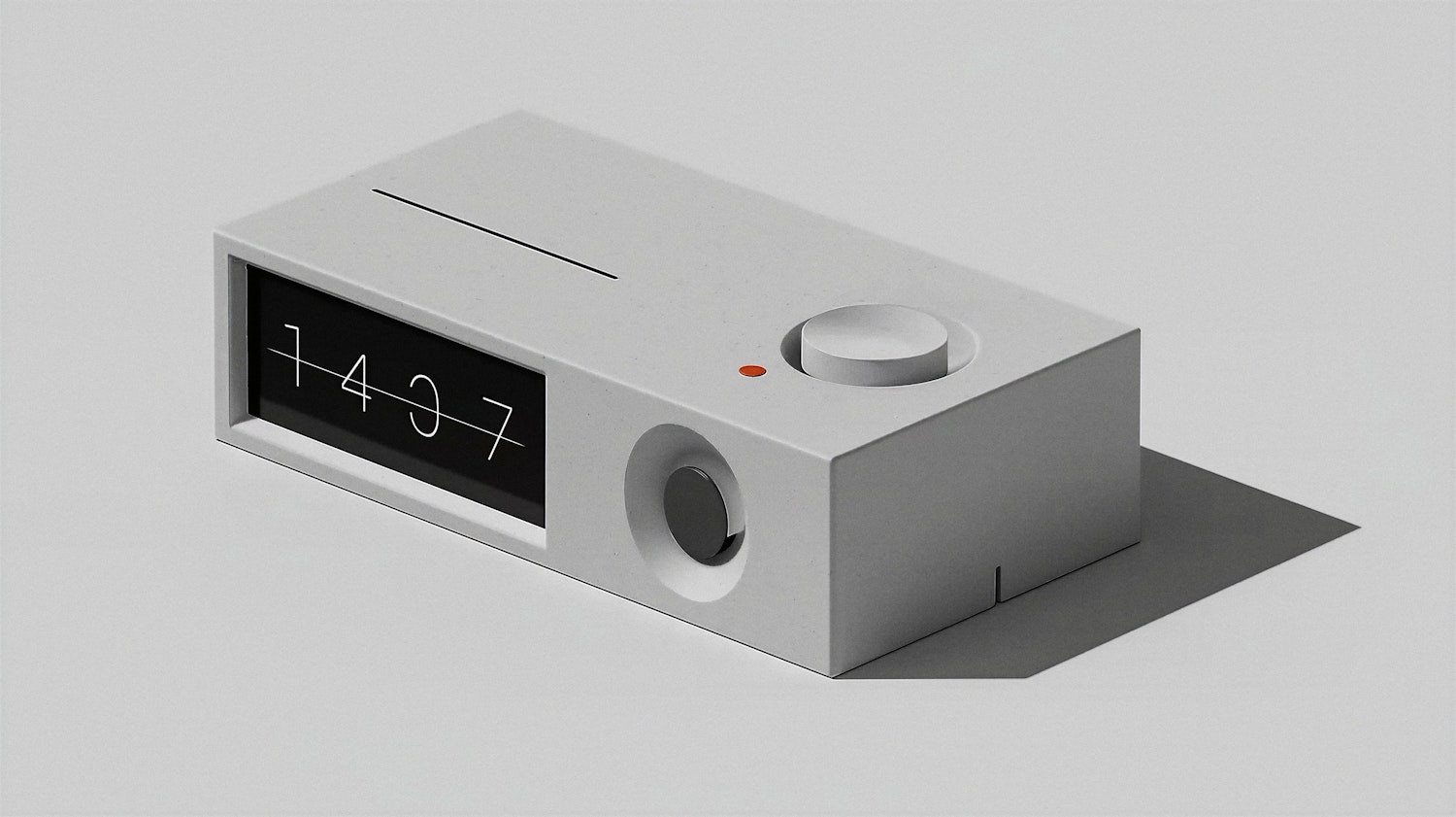 Minimalist white electronic device with a digital time display, circular knob, and red indicator light, set against a neutral gray background.