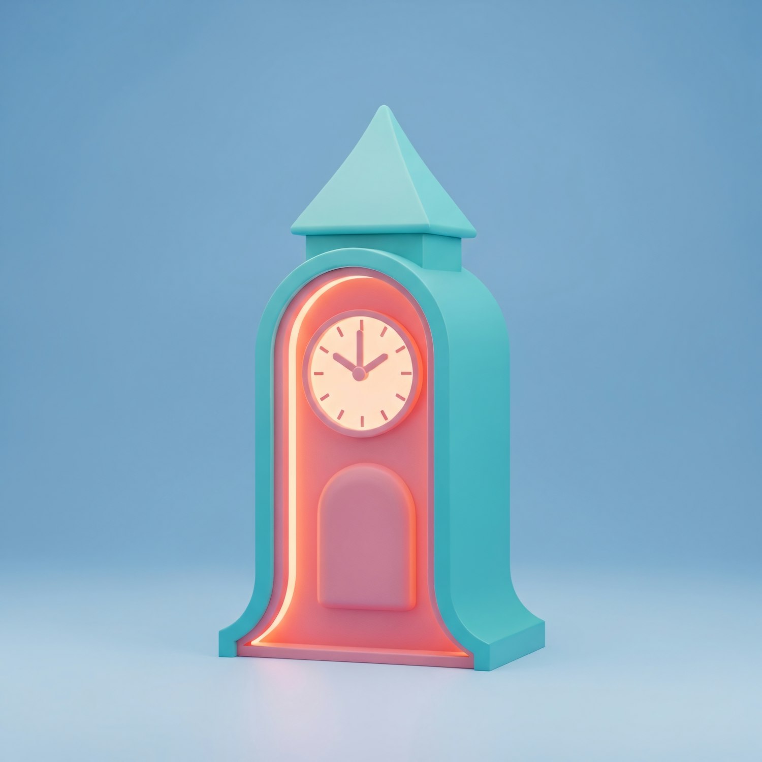 A minimalist 3D-rendered clock tower in turquoise and pink with glowing accents, set against a soft blue background.