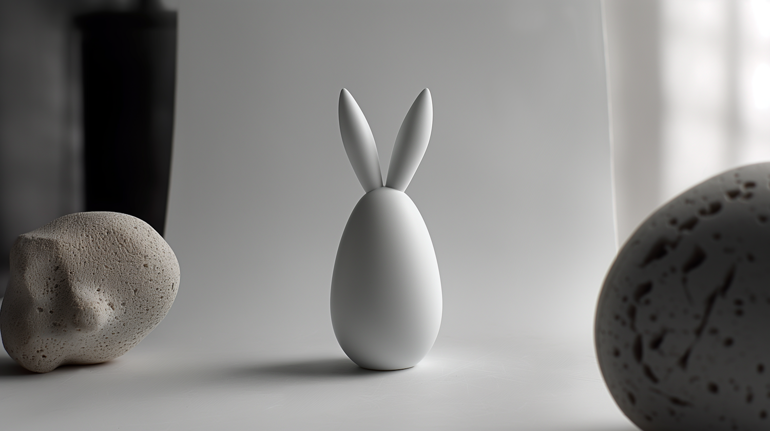 Minimalist scene with a white rabbit-shaped object, textured stones, and soft lighting for a serene, balanced composition.
