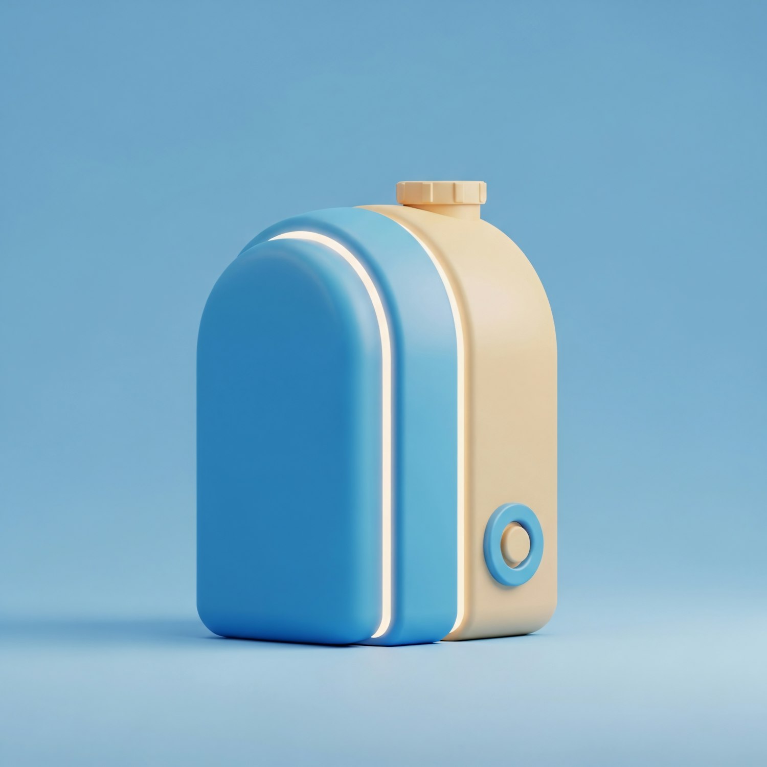 A sleek, modern container with a blue and beige design, featuring a button and a screw-top lid, set against a light blue background.
