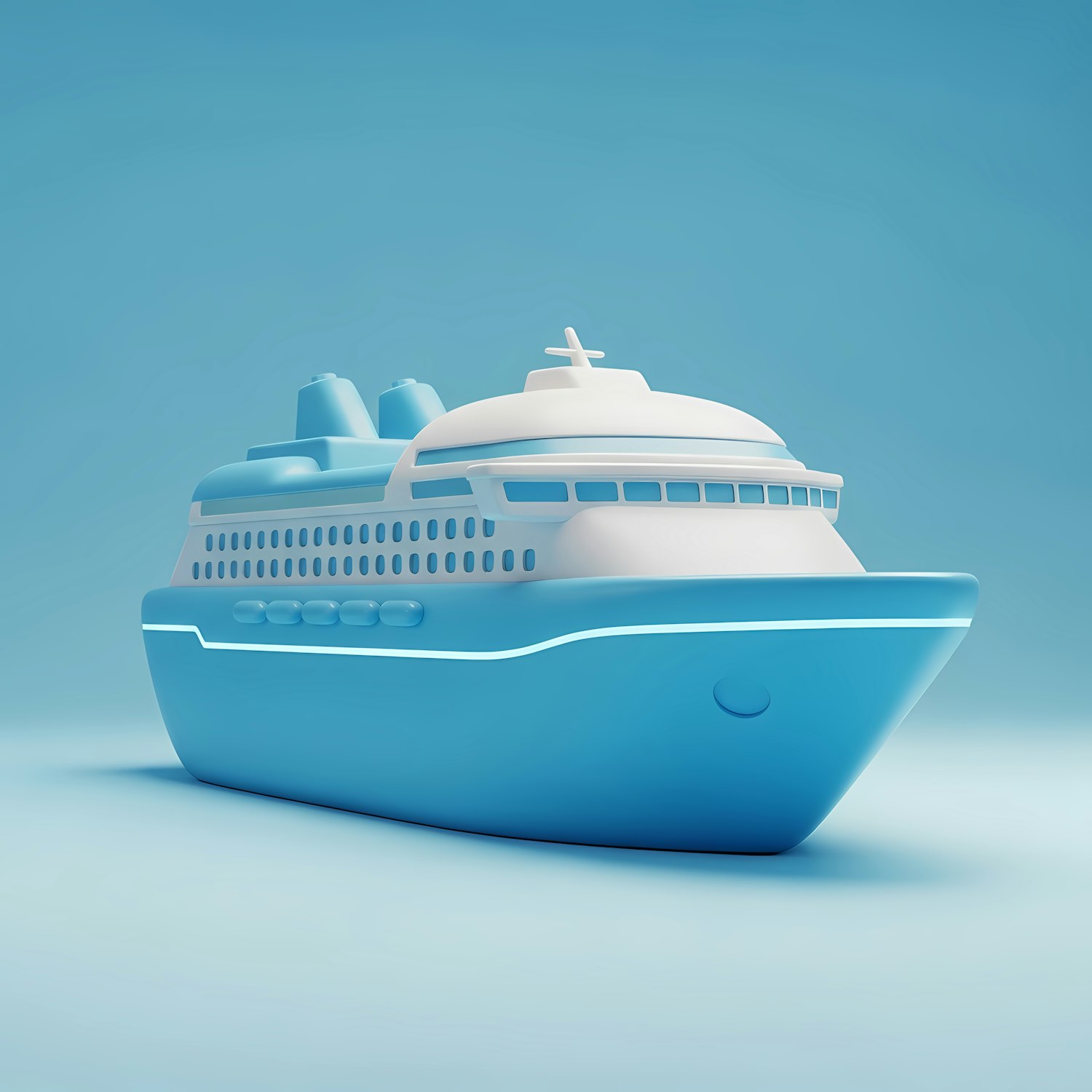 Minimalist 3D illustration of a blue and white cruise ship against a serene blue background, showcasing clean and modern design.
