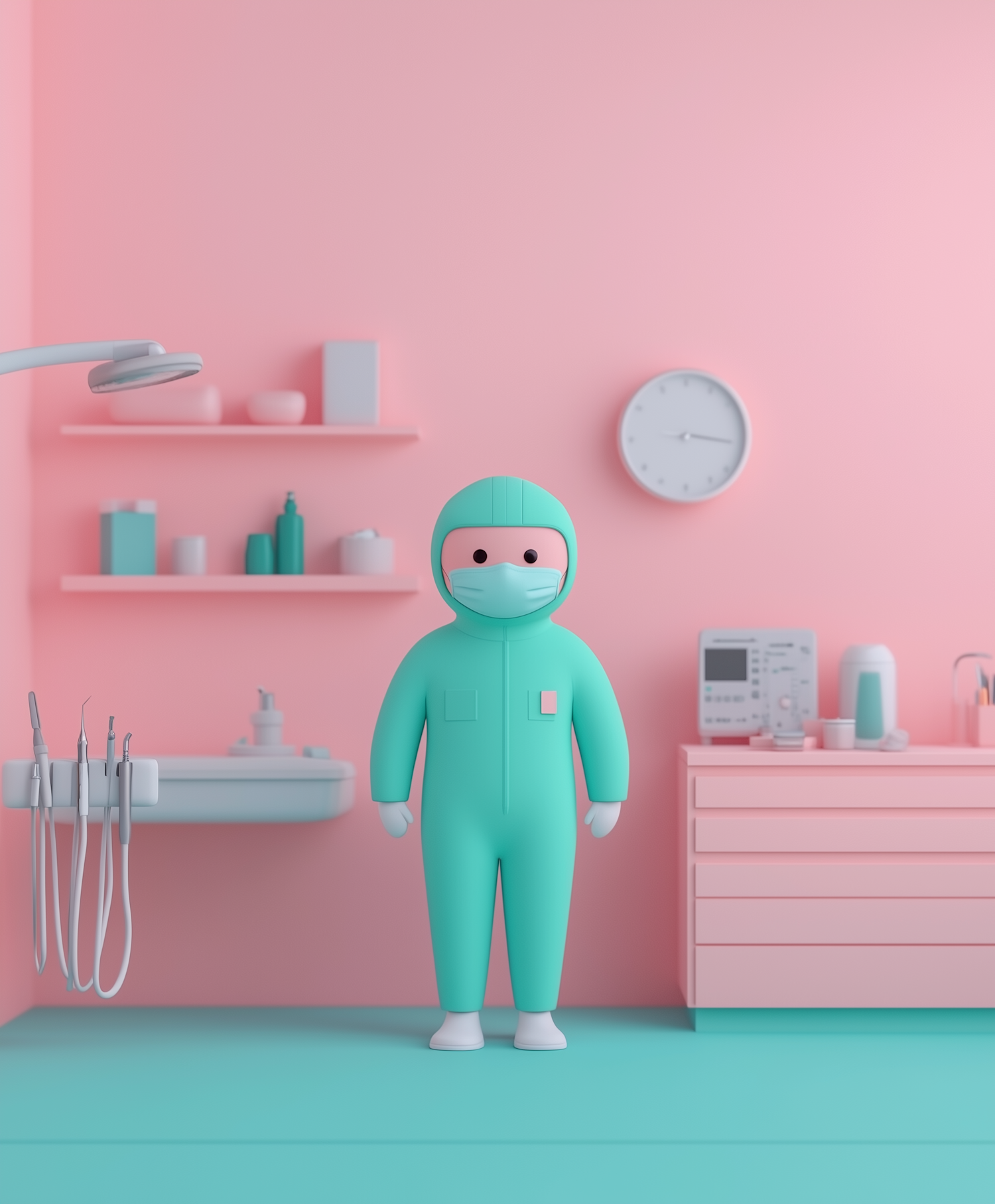 Cartoon medical professional in a pastel pink dental office, wearing a turquoise protective suit and mask, surrounded by dental tools.