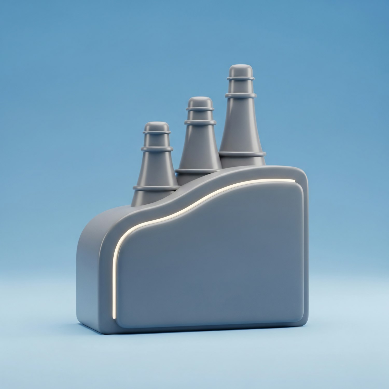 Minimalist 3D rendering of a factory with glowing accents, set against a clean blue background, emphasizing modern design.