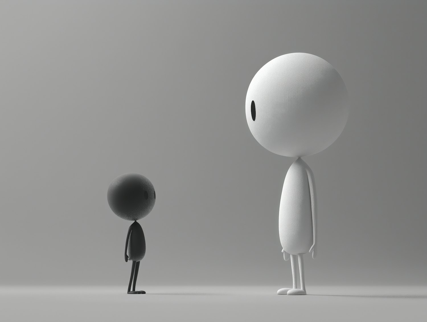 Minimalist black and white humanoid figures stand facing each other in a neutral gray space, highlighting their contrasting sizes and colors.