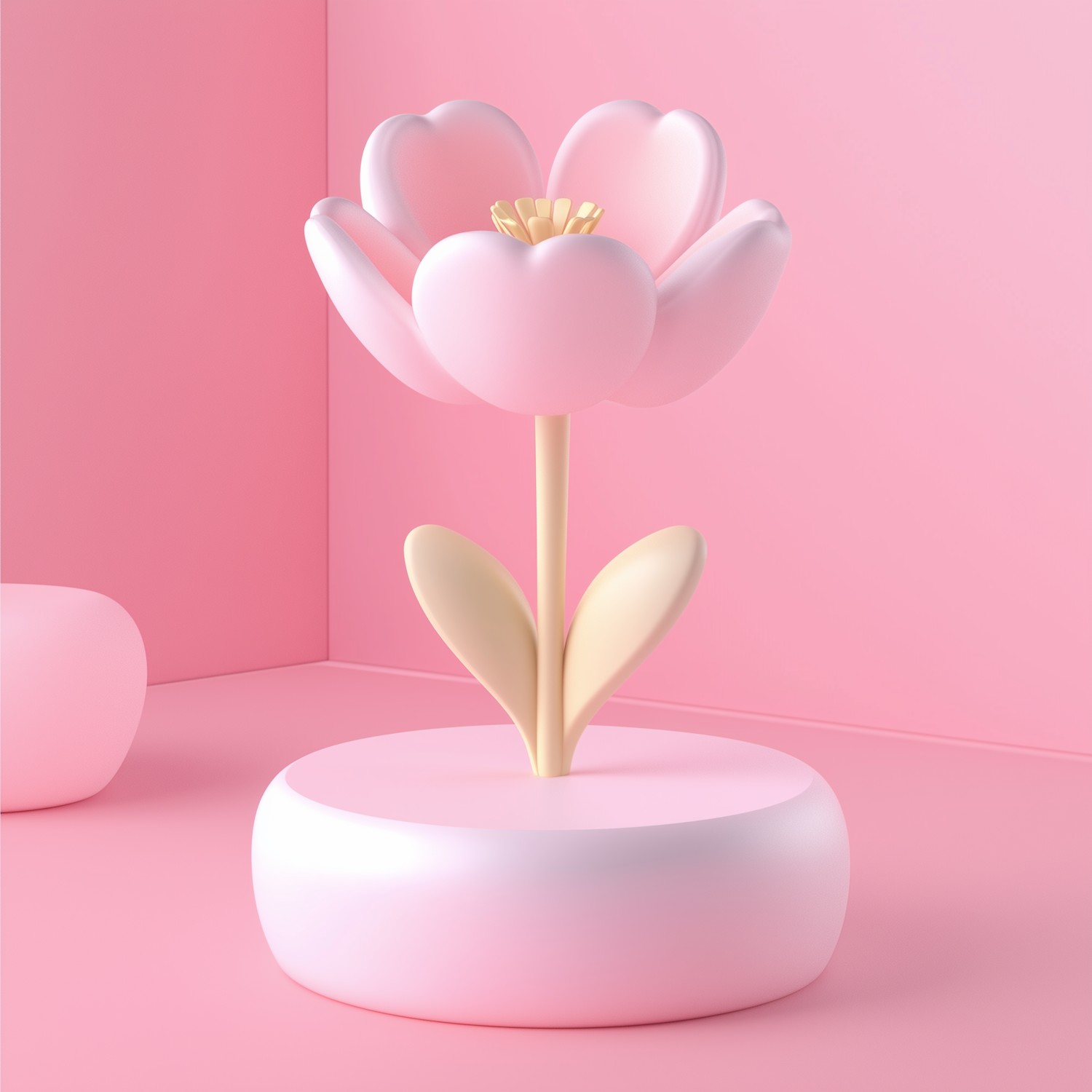 Minimalist 3D-rendered pink flower sculpture with cream leaves on a pink base, set against a solid pink background.