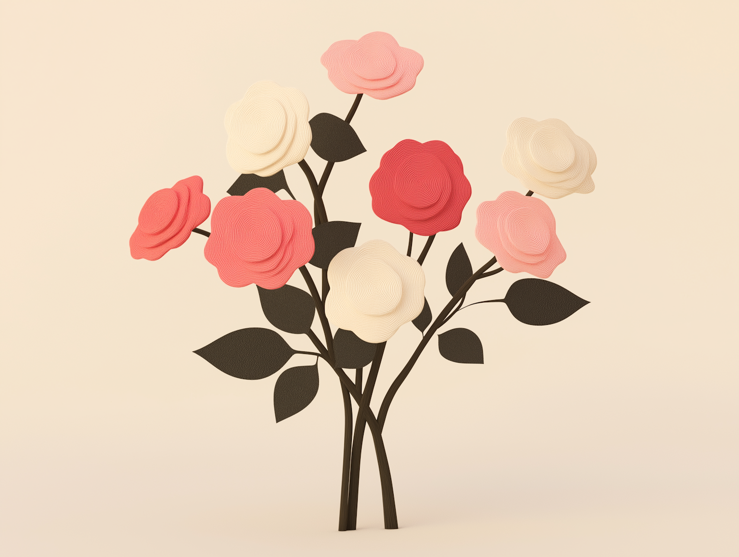 Stylized bouquet illustration with red, pink, and cream flowers on a beige background, featuring textured, layered petals.