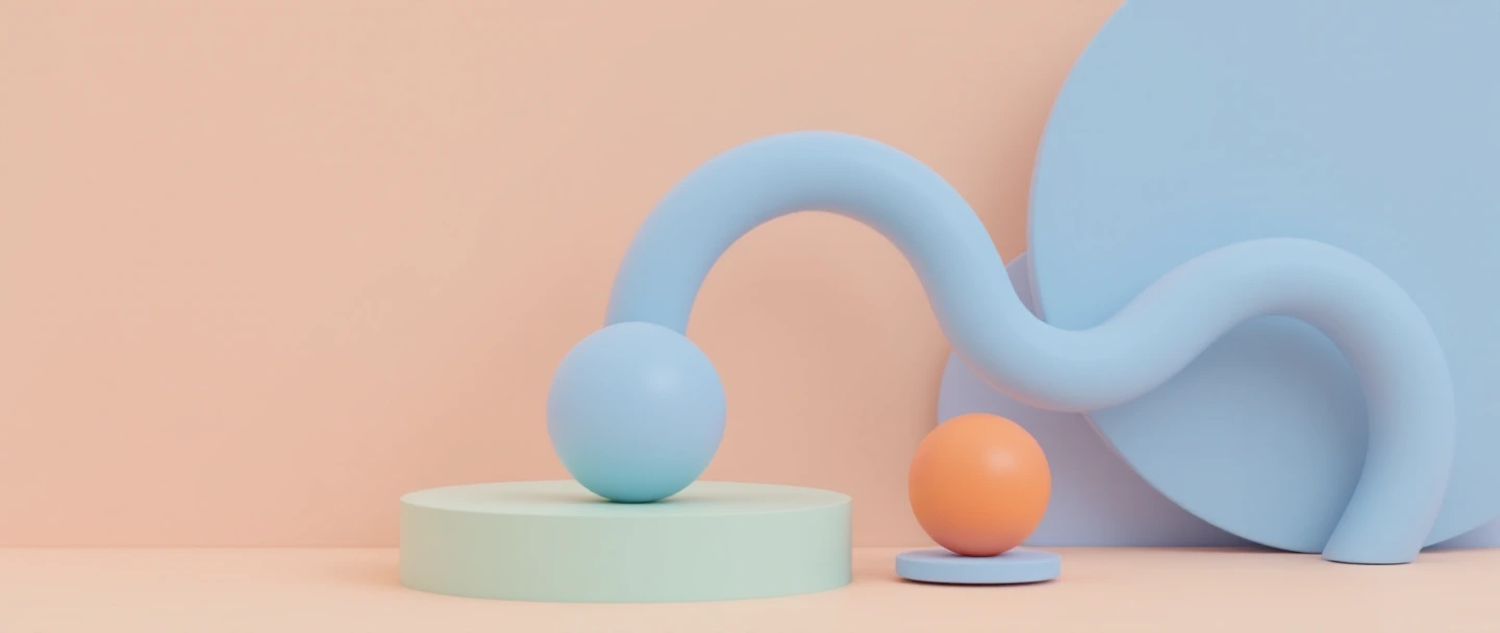 Abstract pastel composition with curved blue structure and spheres on peach background, creating a balanced and harmonious scene.