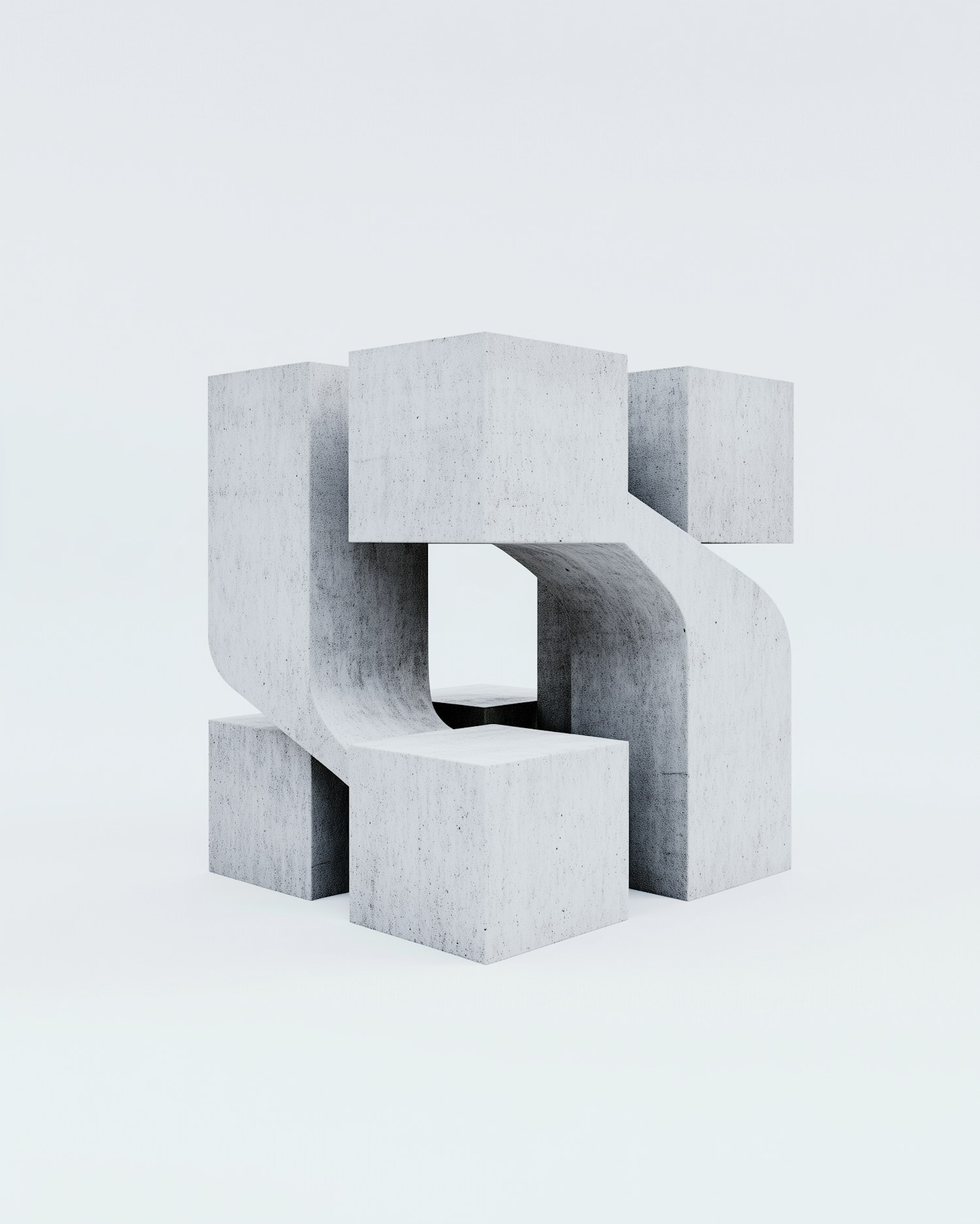 Minimalist 3D concrete sculpture with interlocking cubic and curved forms, showcasing modern design and architectural elegance.