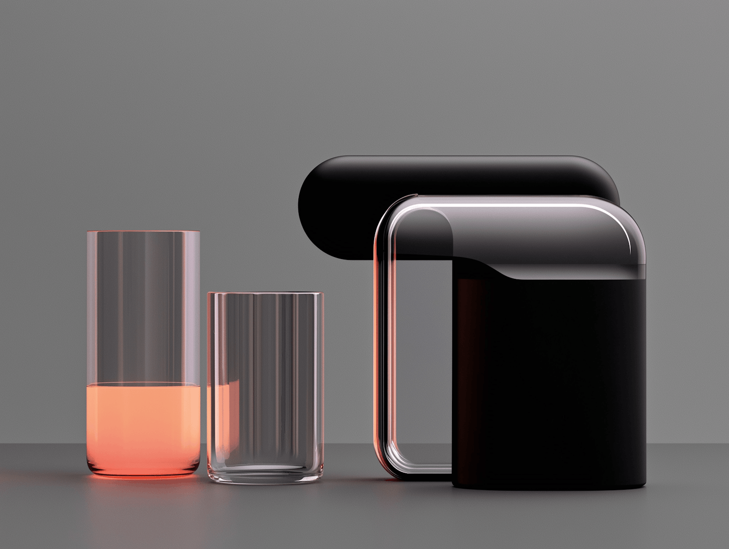 Minimalist design with glowing orange liquid in a glass, a clear glass, and a sleek black container on a gray background.