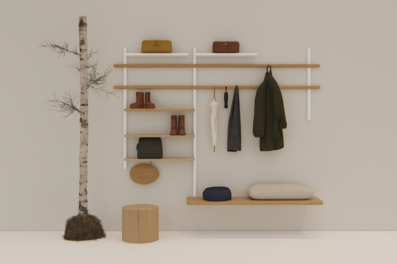Minimalist wall-mounted shelving with boots, bags, and coats, paired with a birch tree and wooden bench for a natural, modern vibe.