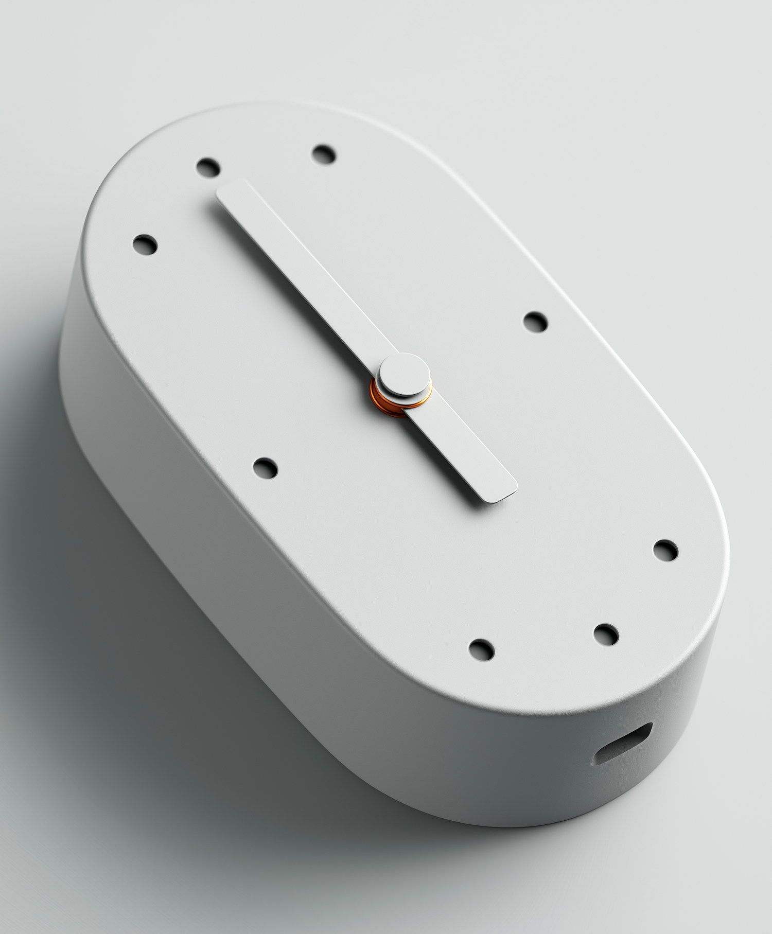 Minimalist white oval clock with sleek design, hour markers, and orange accent. Perfect for modern interiors or smart home setups.
