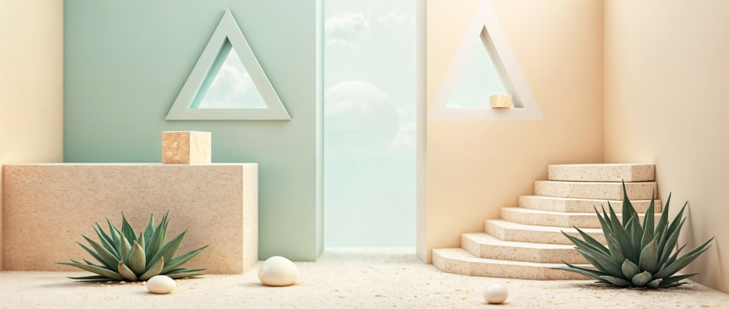 Minimalist pastel-toned architecture with geometric cutouts, agave plants, and a curved staircase in a serene, modern setting.