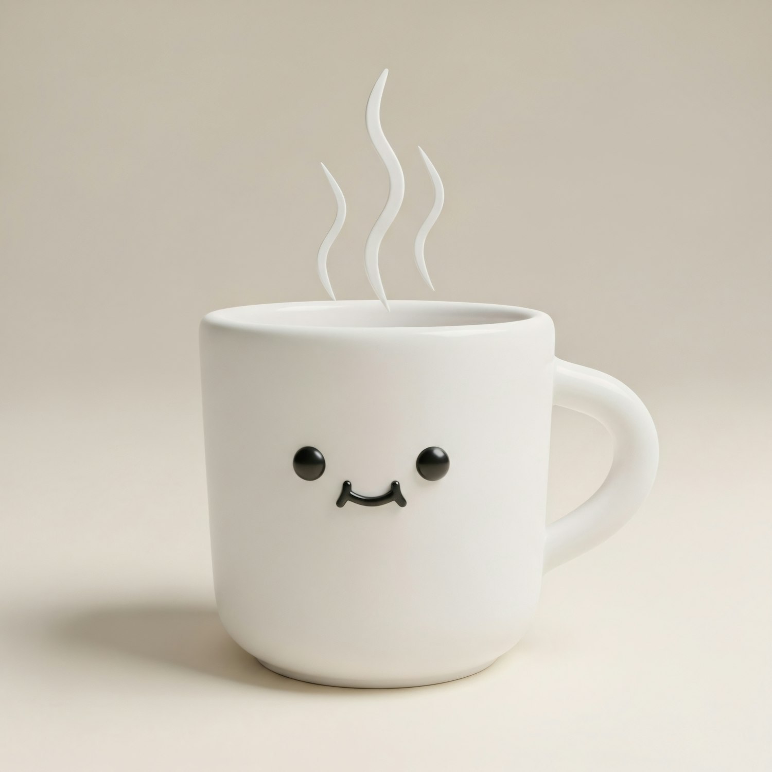 A cute white mug with a smiling face and steam rising, set against a neutral background, perfect for cozy and minimalist vibes.