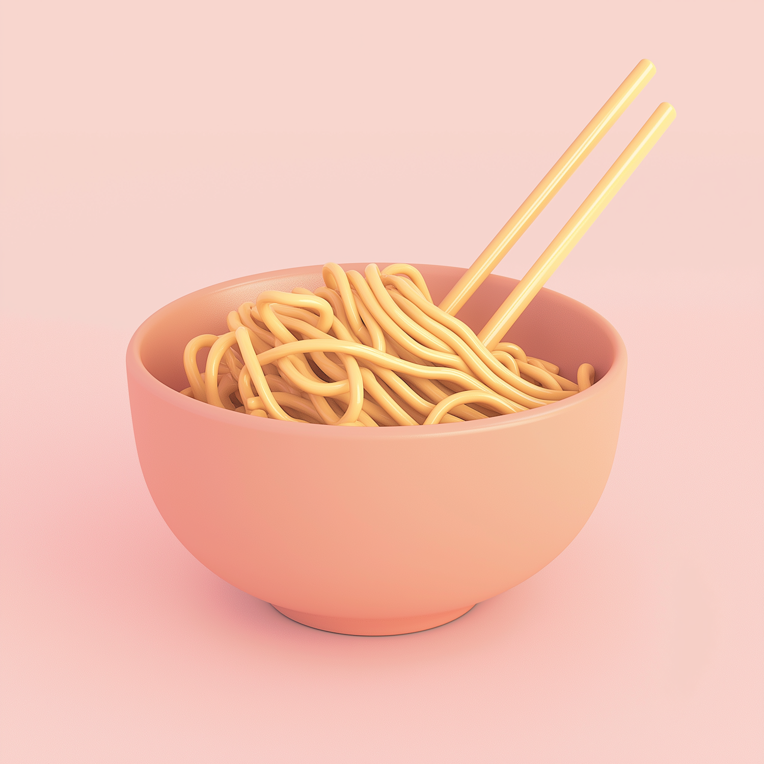 A minimalist 3D rendering of yellow noodles in a peach bowl with matching chopsticks, set against a soft pink background.