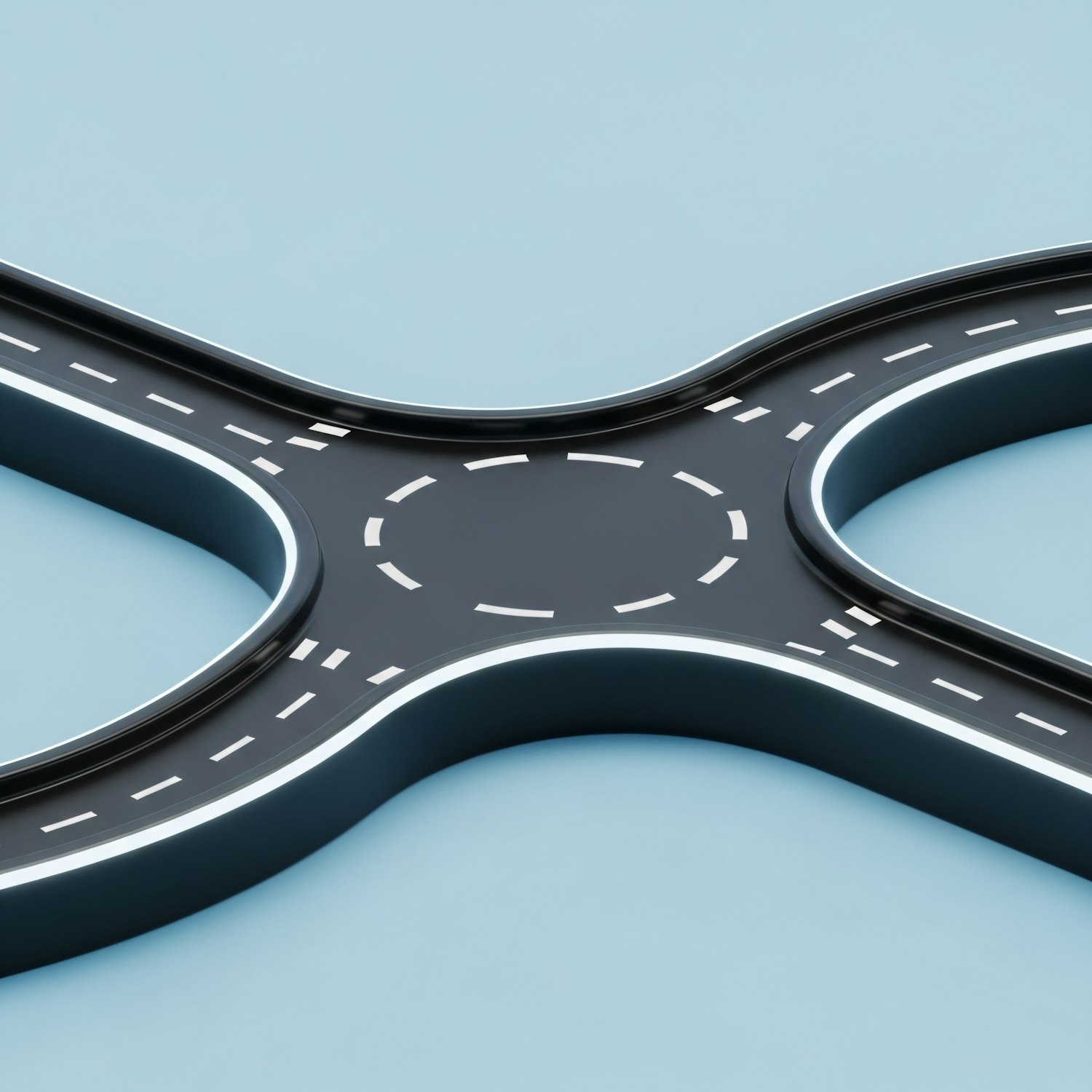A clean 3D-rendered roundabout with four roads extending outward, set against a light blue background for a modern and minimalist look.