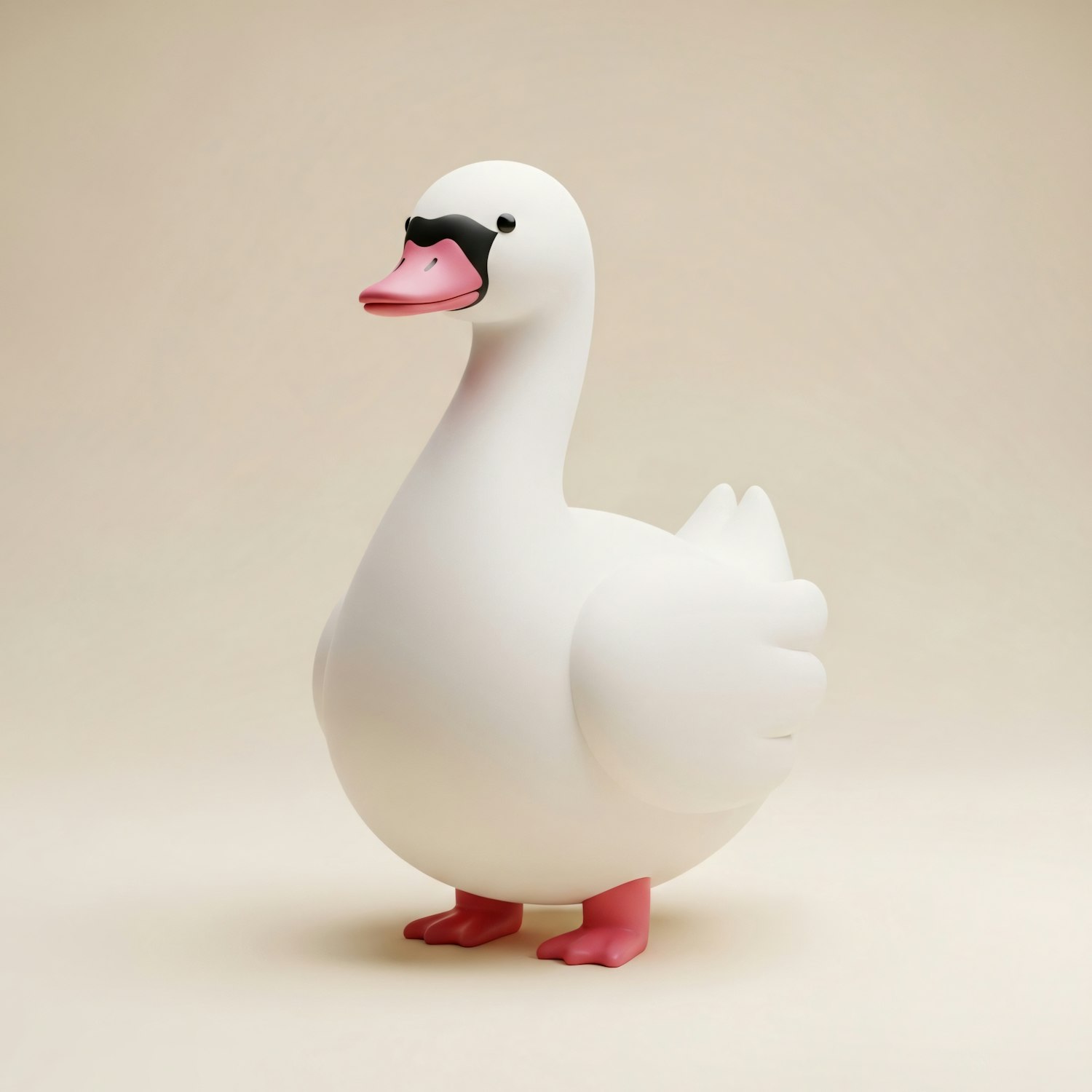 A minimalist and stylized swan design with a white body, pink beak, and legs, set against a neutral beige background.